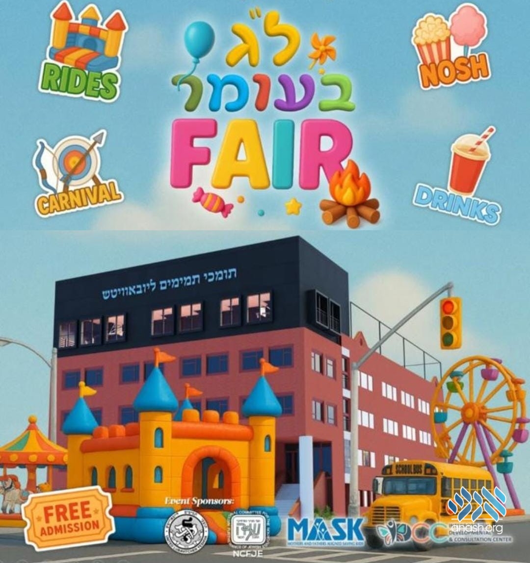 The Crown Heights community is invited to attend a festive Lag BaOmer Fair this Friday afternoon, hosted by Lubavitcher Yeshiva in conjunction with NCFJE, on Tomchei Temimim Way, featuring rides, carnival experiences, nosh, and refreshing drinks.