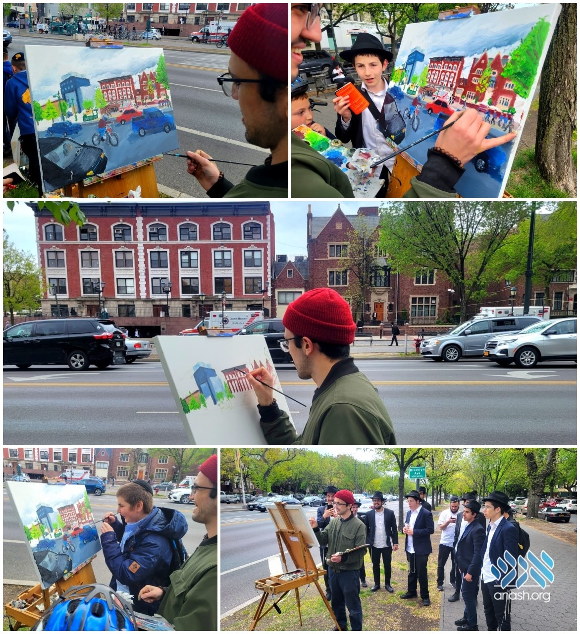Crown Heights children gathered ’round and were even given a chance to dab some paint themselves as artist Yosef Tovshteyn painted 770 on Eastern Parkway.