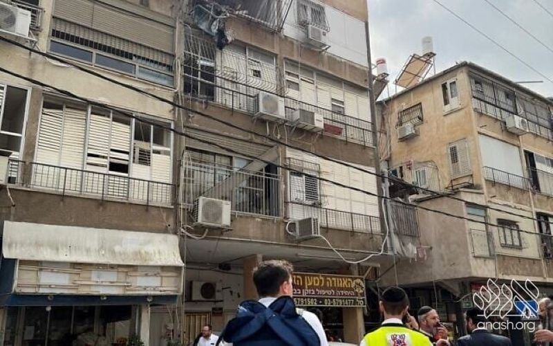 Emergency forces rushed to Yerushalayim Street in Bnei Brak after a cluster munition struck a residential area during the barrage toward central Israel. The explosion caused significant damage to a building and nearby apartments, shattering windows and sending heavy steel fragments flying across the neighborhood.