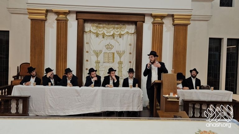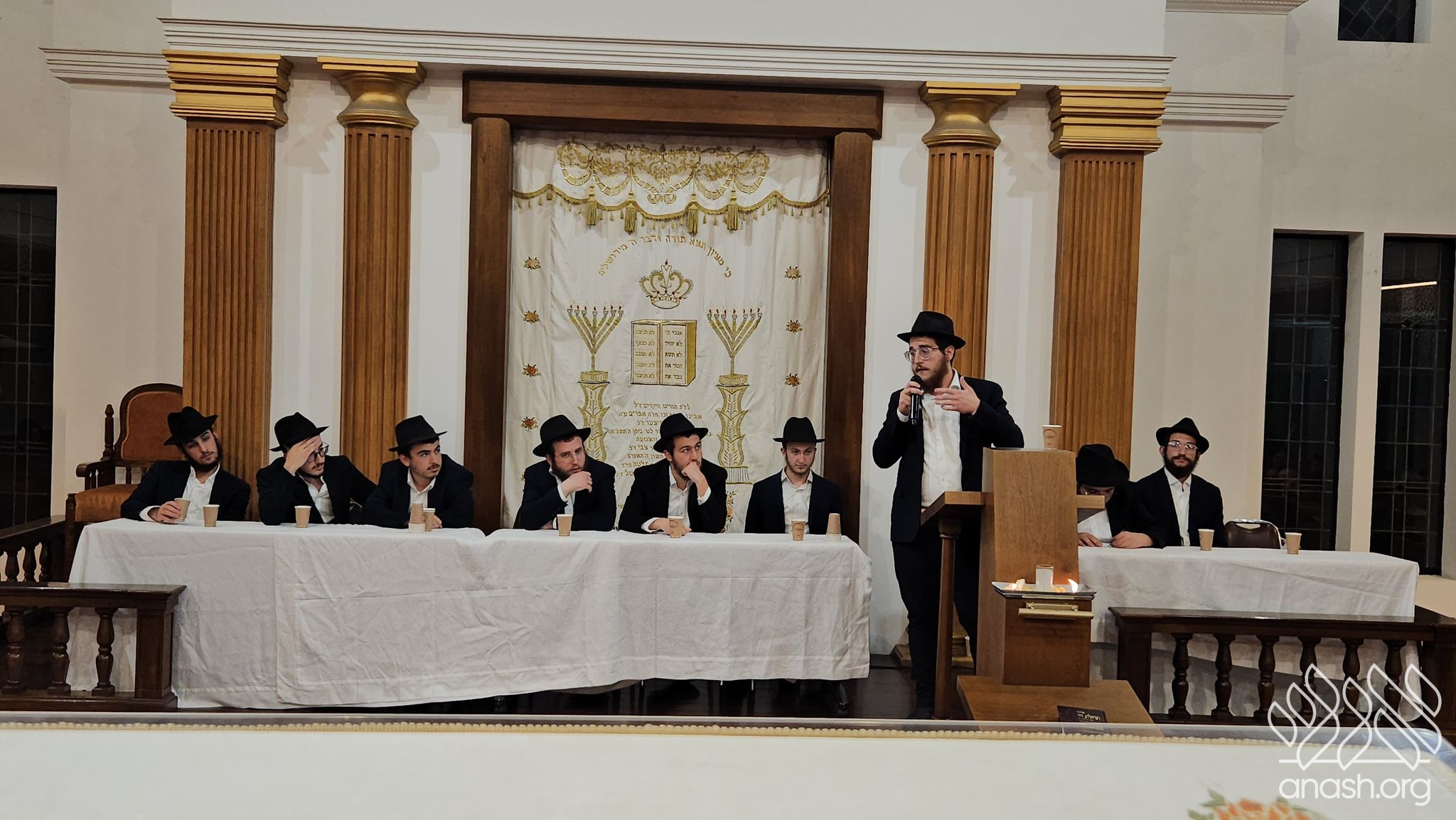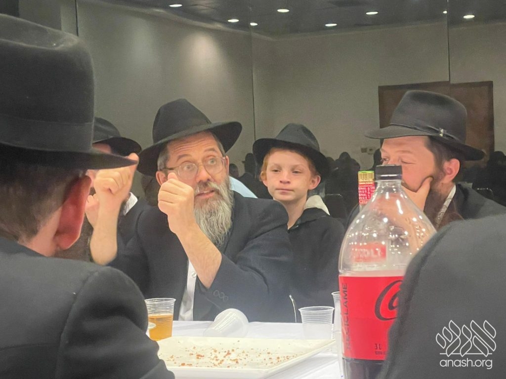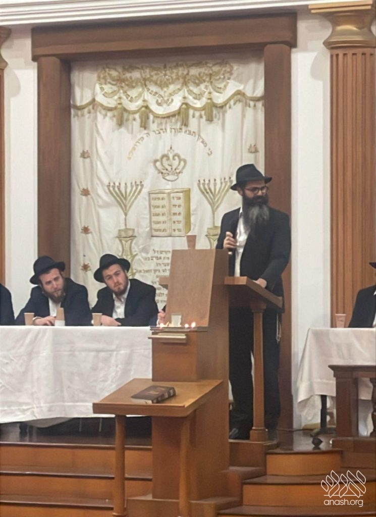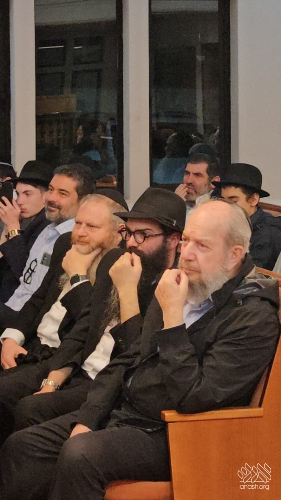 The audience was then uplifted by divrei Torah from hatomim hashliach Eli Hecht, who spoke about a sicha of the Rebbe on this year’s maseches Bava Kama and explained how a shor muad can be transformed back into a shor tam through a shinui reshus, relating this lesson to our work with our nefesh habehamis by getting involved in the reshus of Torah and mitzvos.