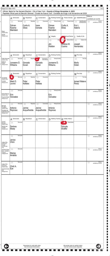 City Council: Yehuda Shaffer/Benny Rosenberger (whichever is on your ballot); If you don’t understand yourself, I can’t help you…