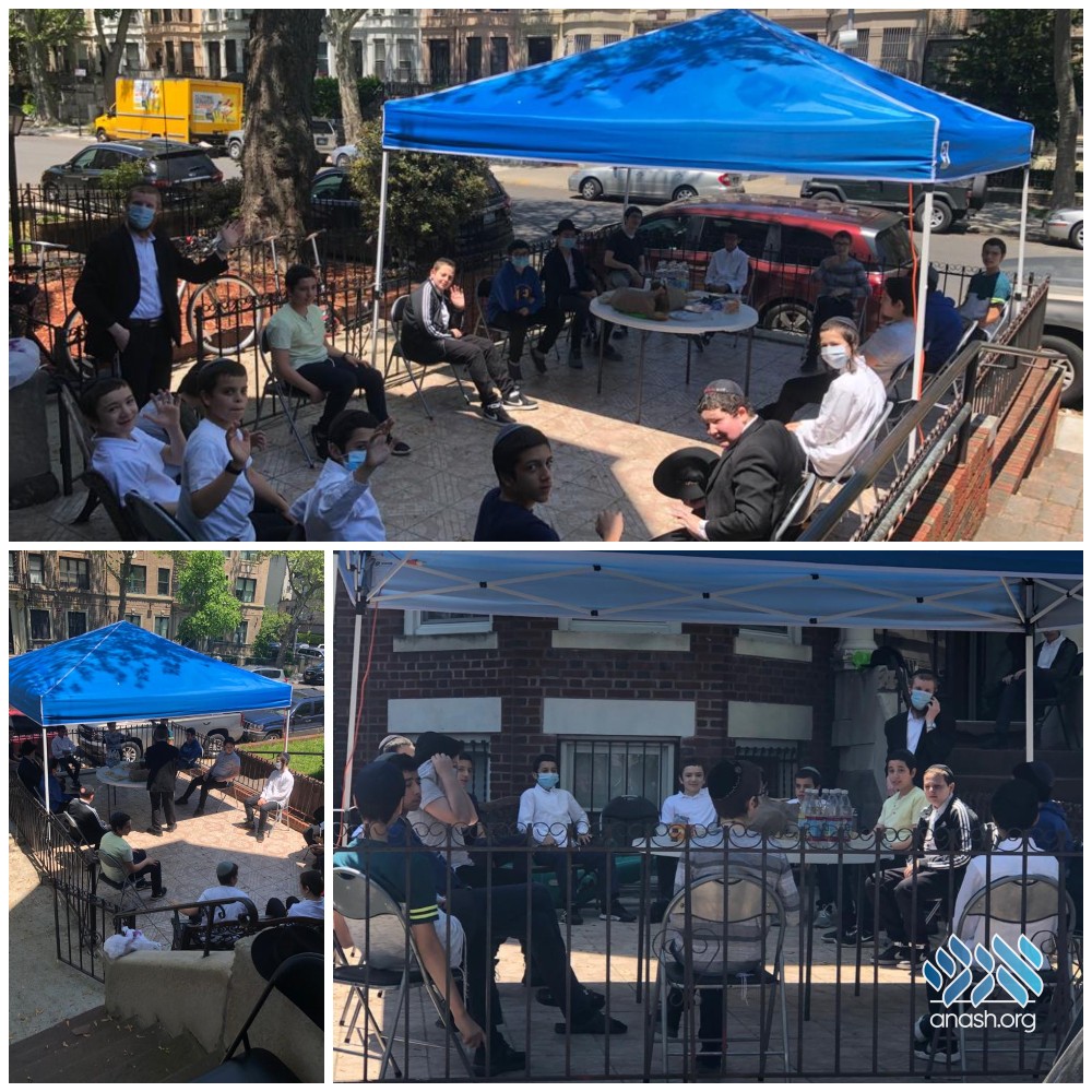 Students of Rabbi Vogel’s 7th-grade class in Lubavitch Yeshiva got together for a socially distanced brunch at the Ohel Benish porch minyan on President Street.
