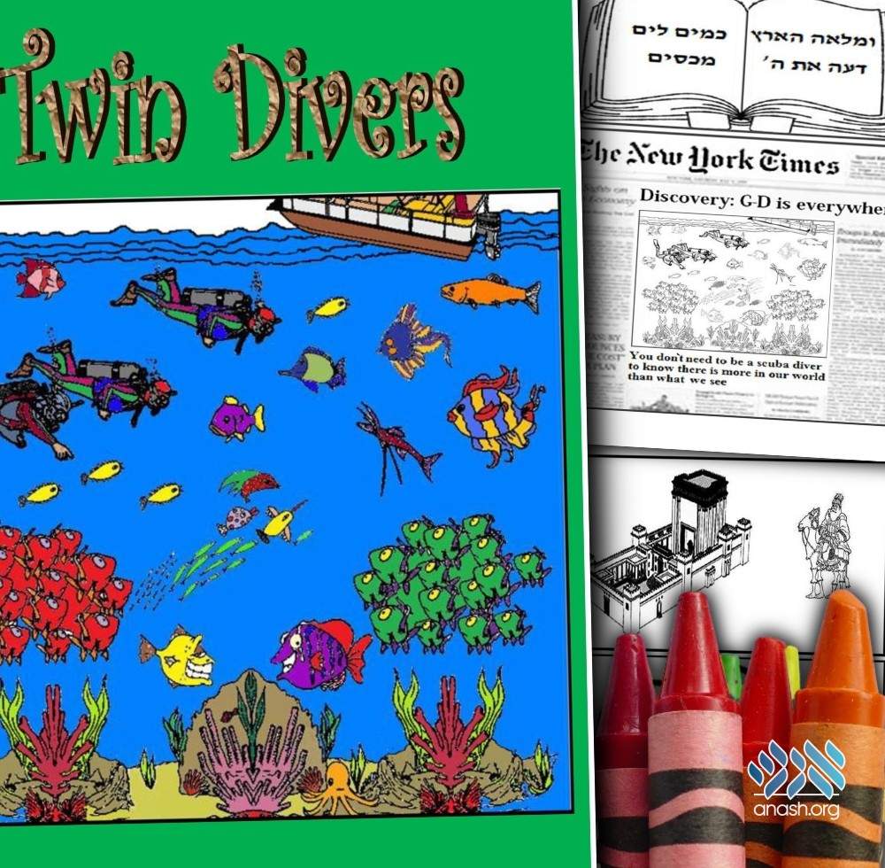 “Twin Divers” is a kid’s story-coloring book for children ages 5 and up. The book was written in order to explain the point of “open your eyes” which the Rebbe strongly stressed, through a story adapted especially for children of that age. Their parents and older siblings will enjoy sharing the book with the kids.