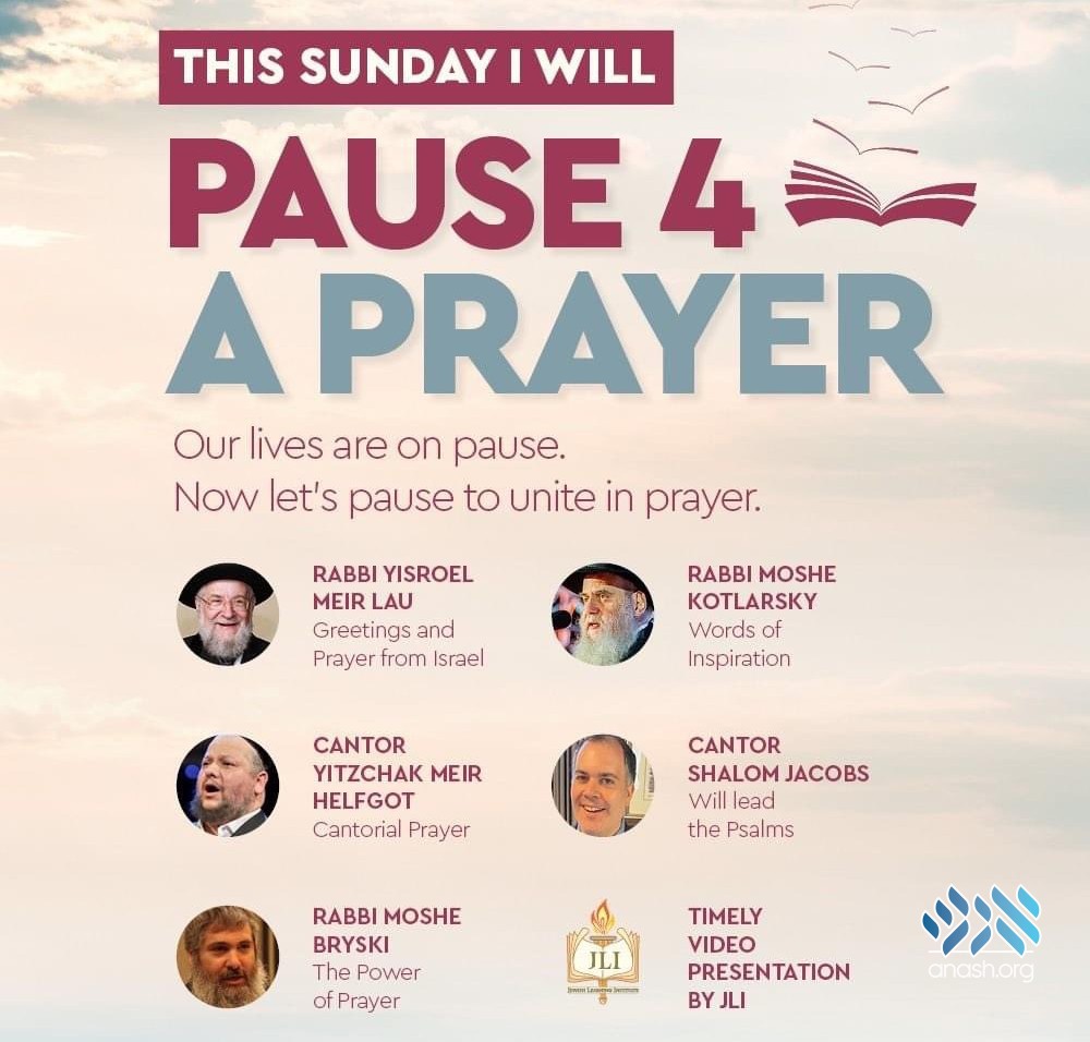 The program streaming live on Chabadoncall.com/pause4prayer will include time for individuals to pray on their own level for the blessings each needs personally, along with reciting group prayers for the world at large. The gathering will be addressed by Rabbi Yisrael Meir Lau, former Chief Rabbi of Israel, and will be led in prayer by the soul-stirring melodies of a world-famous Chazan.