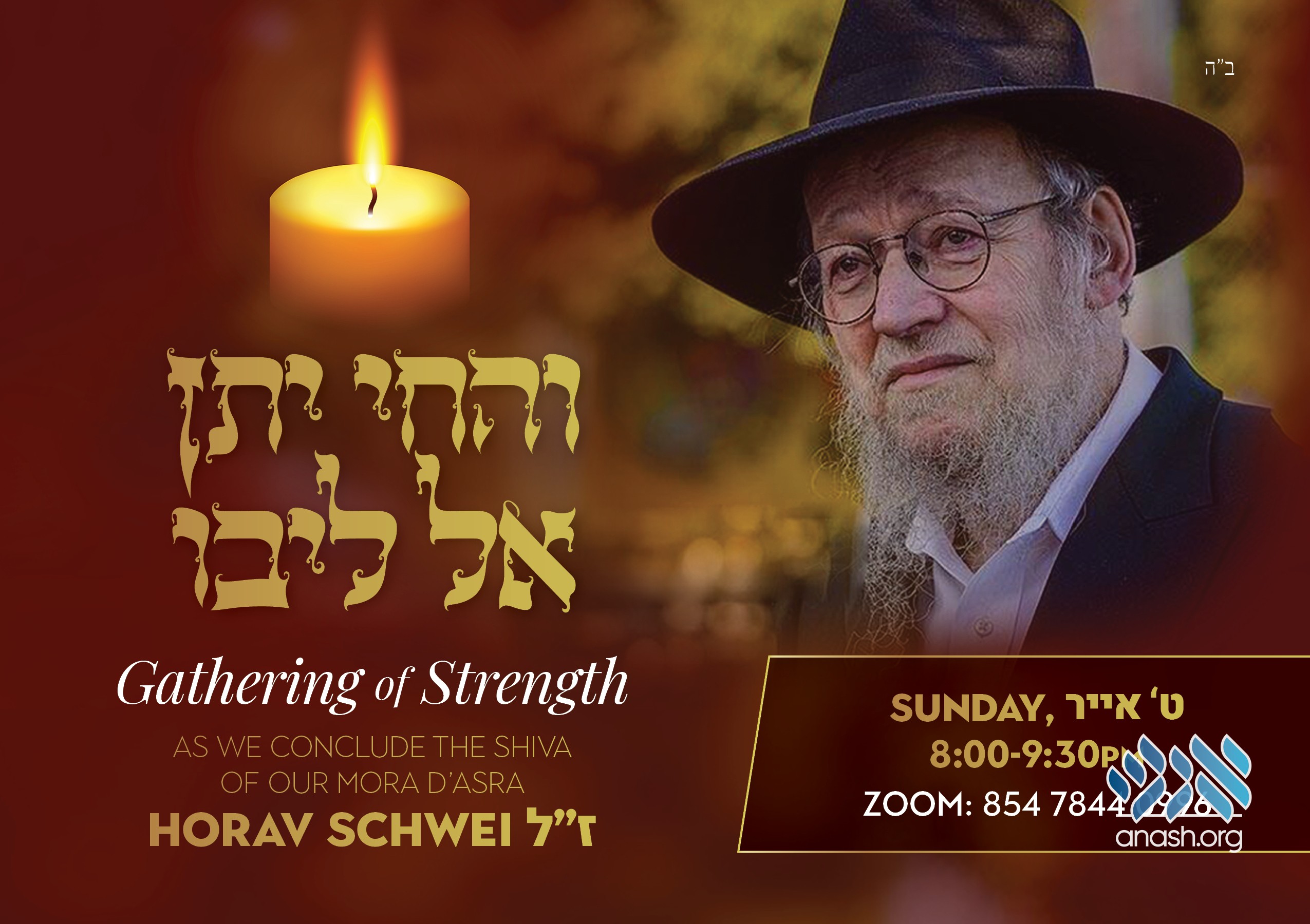 UPDATE: Postponed to Sunday: A special gathering marking the conclusion of the Shiva of Mara D’asra, Harav Aharon Yaacov Schwei, a”h, will take place today, Vov Iyar, 6:00-7:45pm via Zoom.