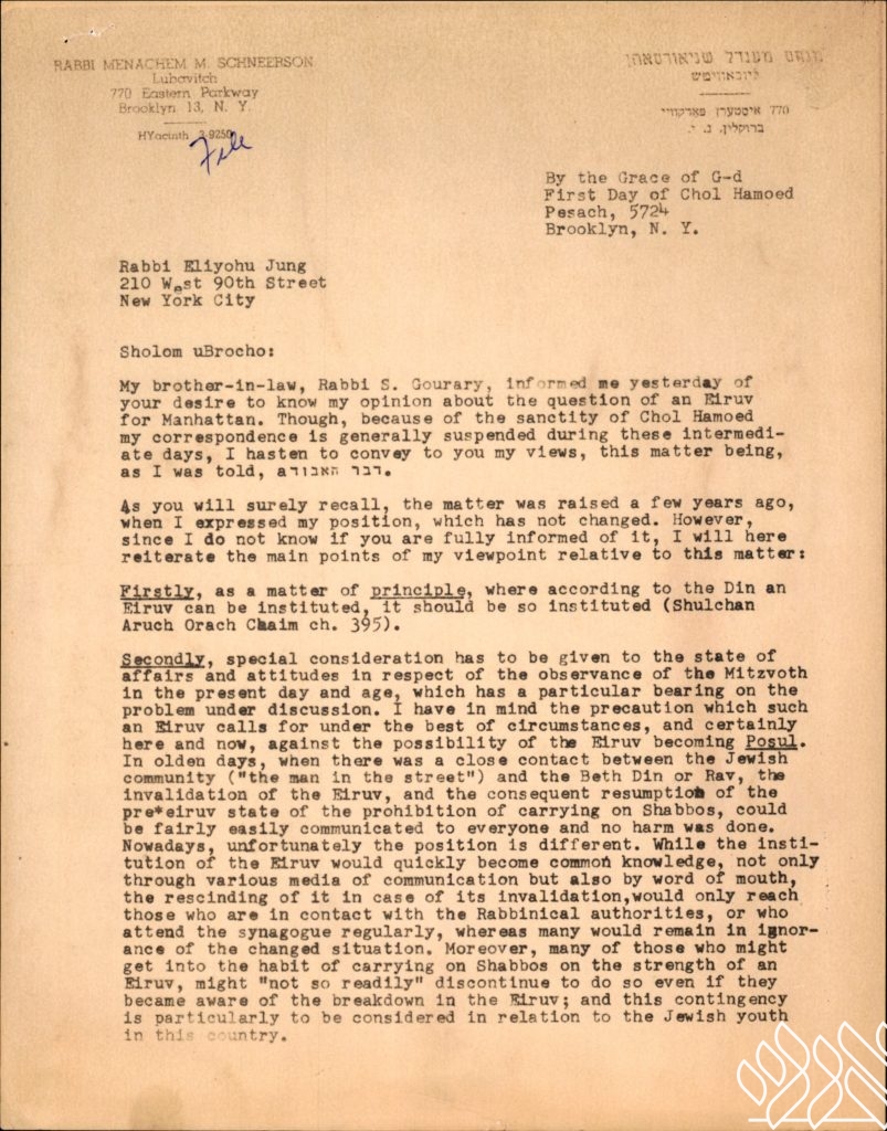 As reported previously by Anash.org, in 5724 (1964), a group of New York rabbonim asked to meet with the Rebbe regarding building an eruv in Manhattan. The Rebbe instead penned a letter to them, dated the first day of Chol HaMoed Pesach, in English, spelling out his position regarding building an eruv in New York.