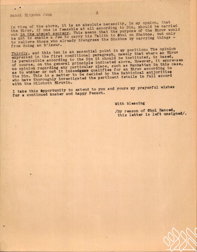 However, recently, the letter, addressed to Rabbi Eliyahu (Leo) Jung, has been published from the archives of Rabbi Dr. Norman Lamm. Rabbi Lamm was the assistant rabbi to Rabbi Jung at the Jewish Center in Manhattan at the time this letter was sent, and both Rabbi Jung and Rabbi Lamm were active in launching the Manhattan eruv.