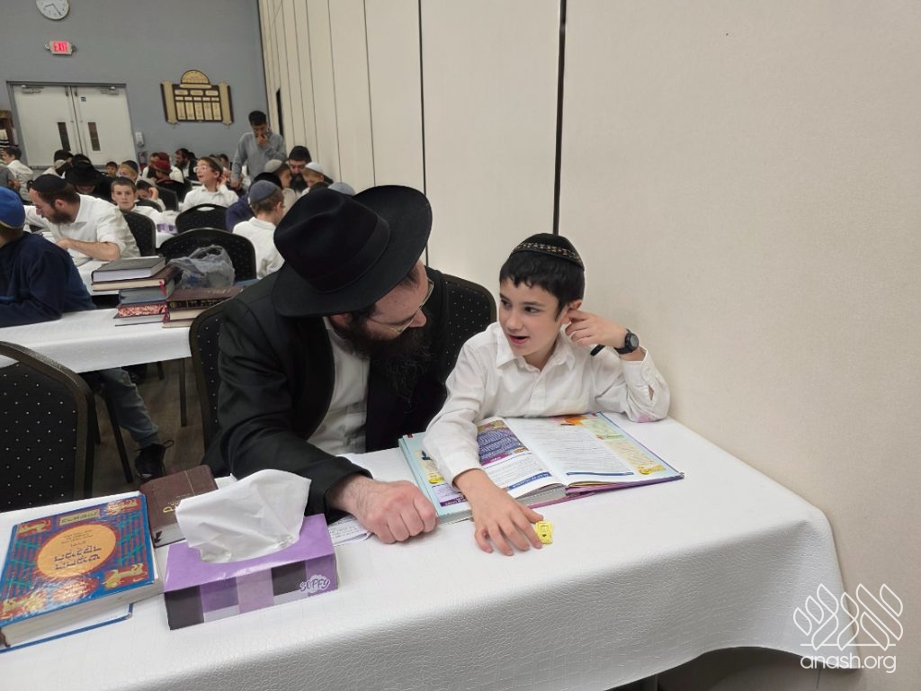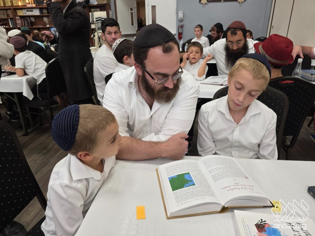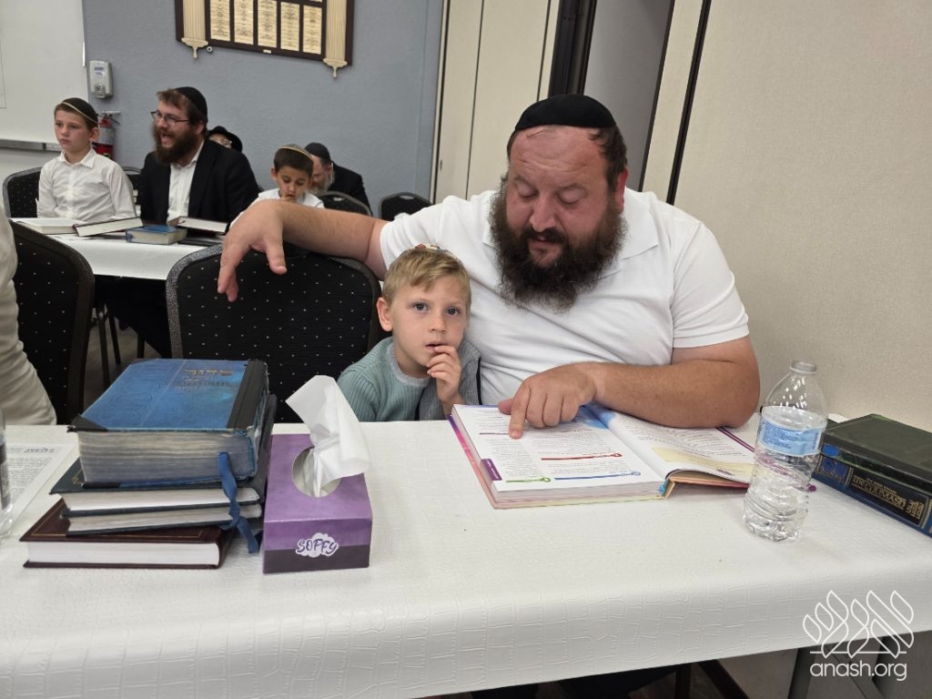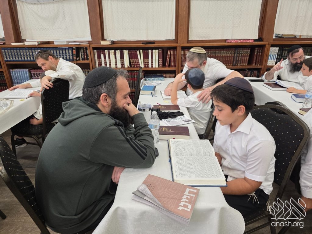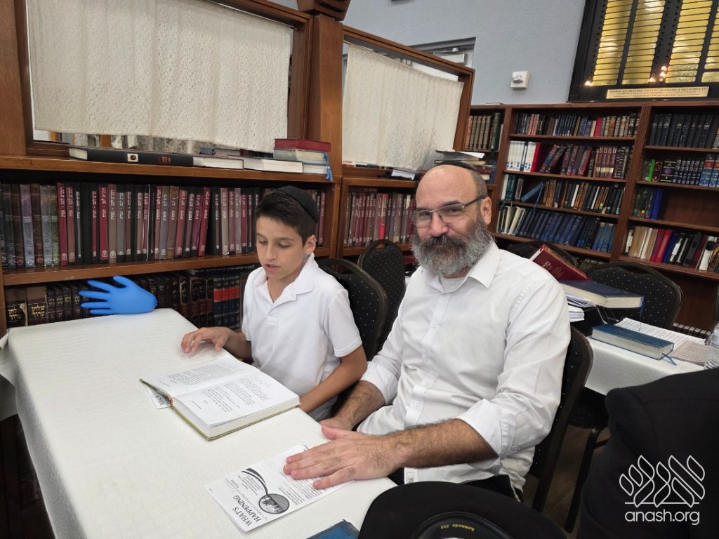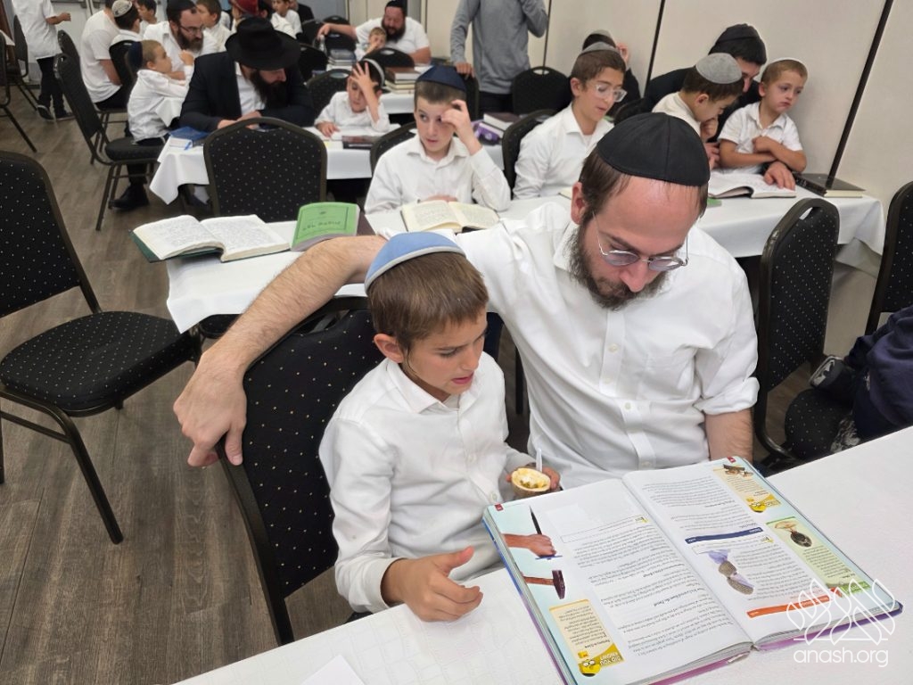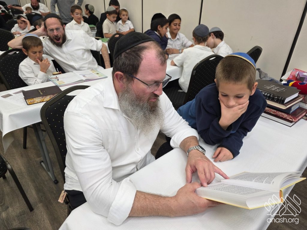 The program gathered fathers and sons from across the community for an hour of quality learning time after Shabbos concluded. The fathers chose a sefer, reviewing material their sons had studied in school, or learning a new topic together with their children.