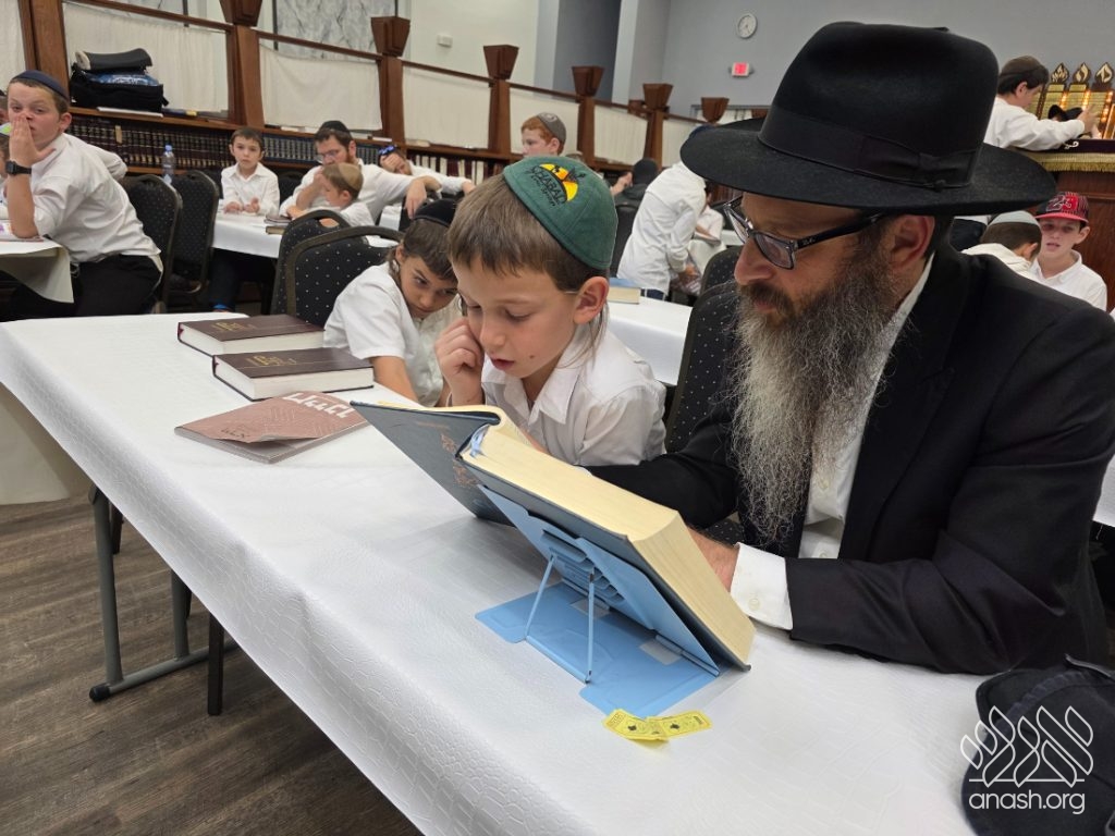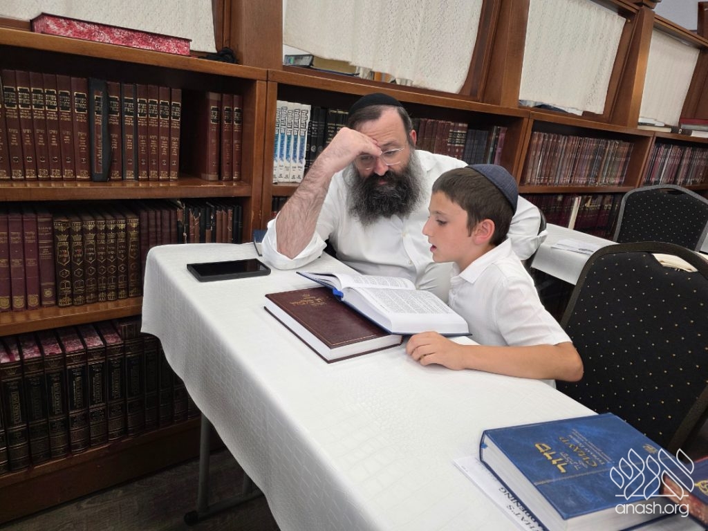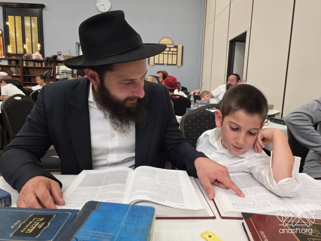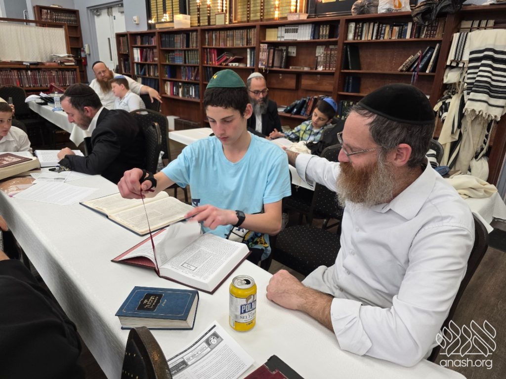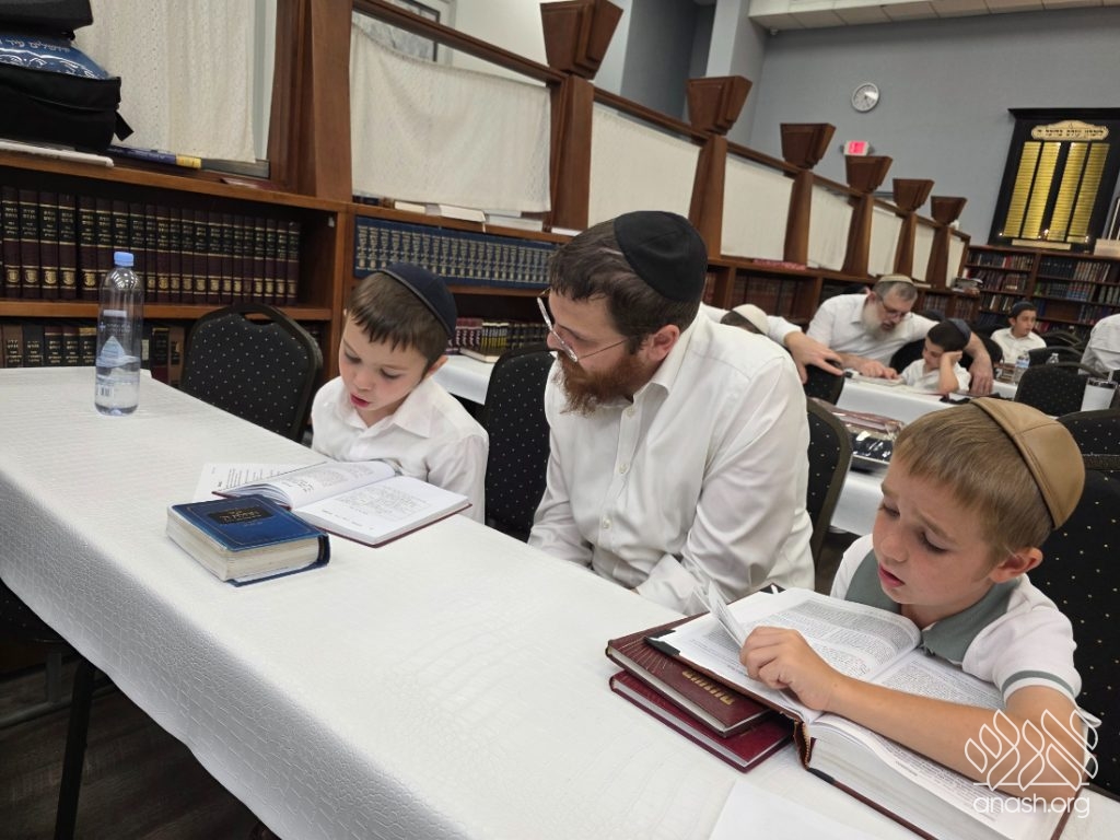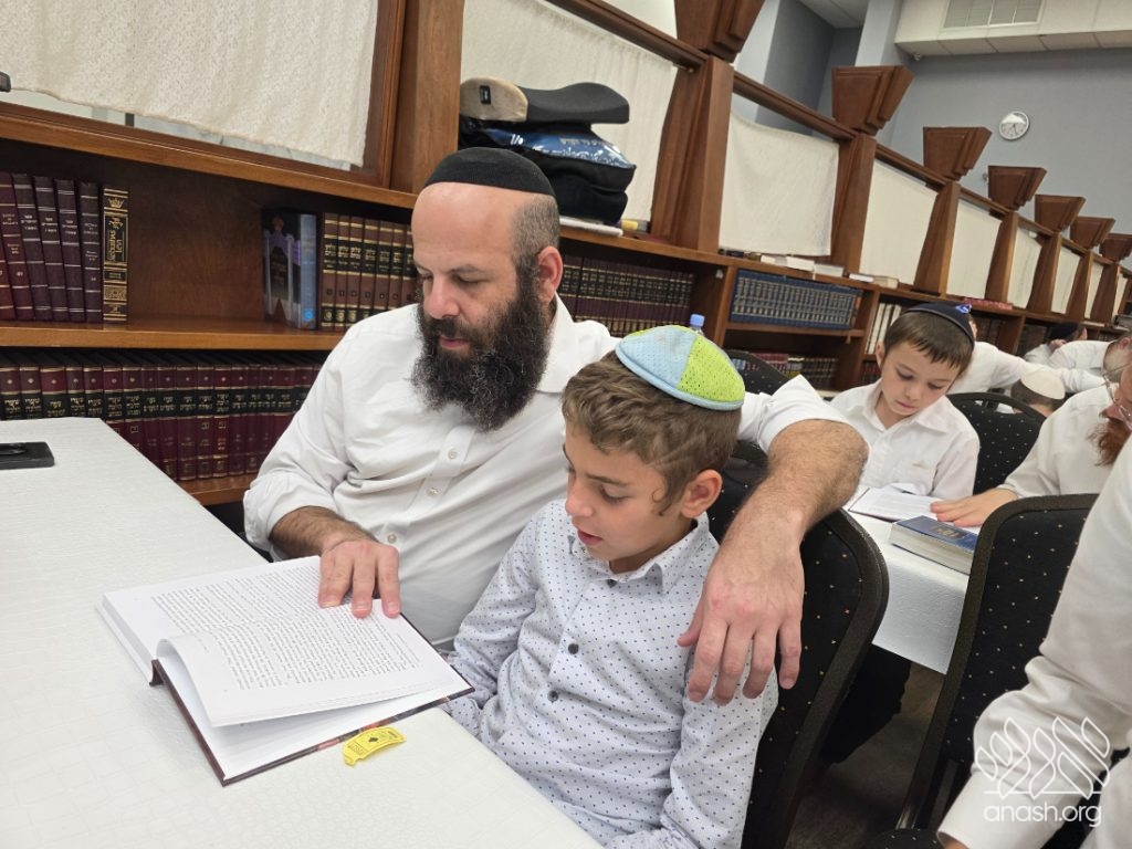 The program gathered fathers and sons from across the community for an hour of quality learning time after Shabbos concluded. The fathers chose a sefer, reviewing material their sons had studied in school, or learning a new topic together with their children.