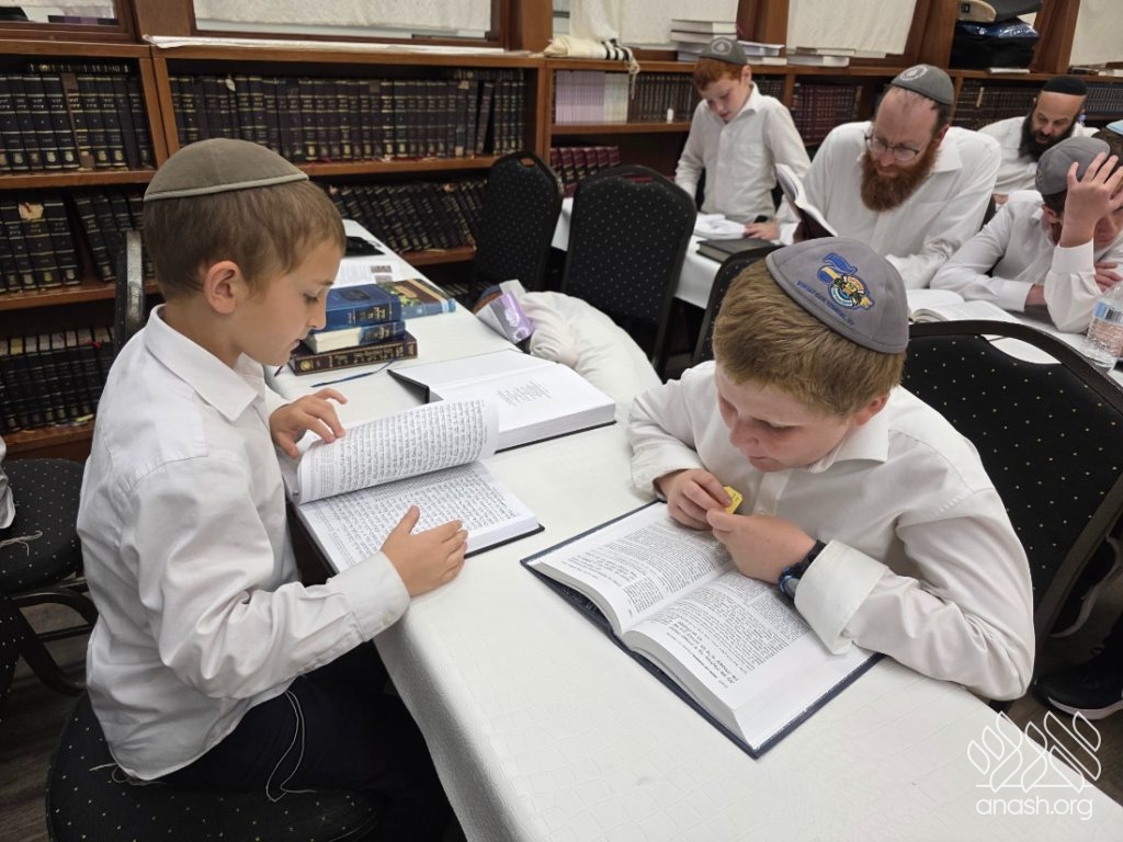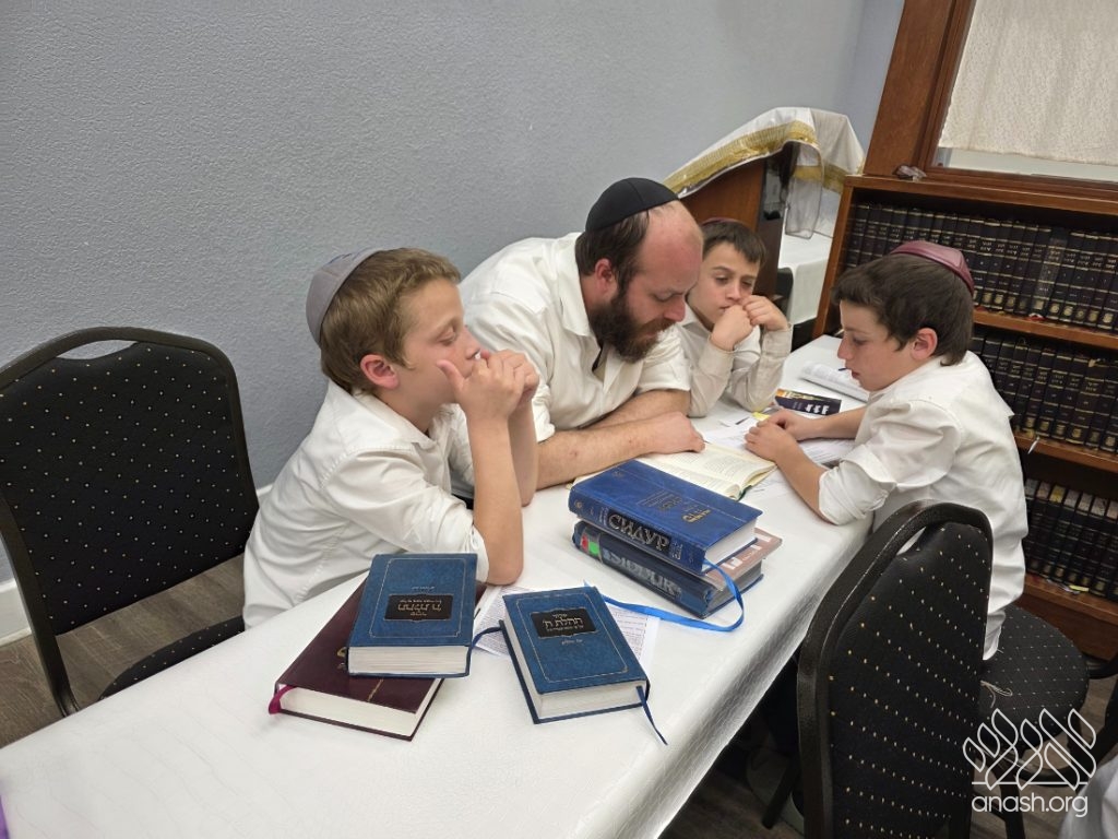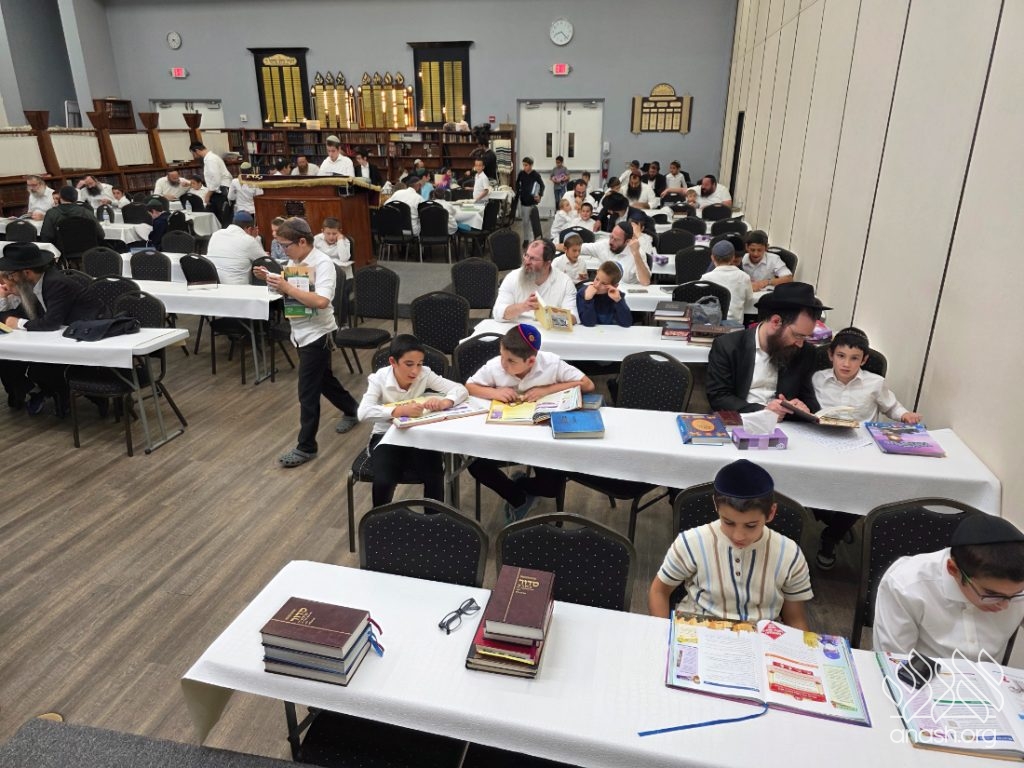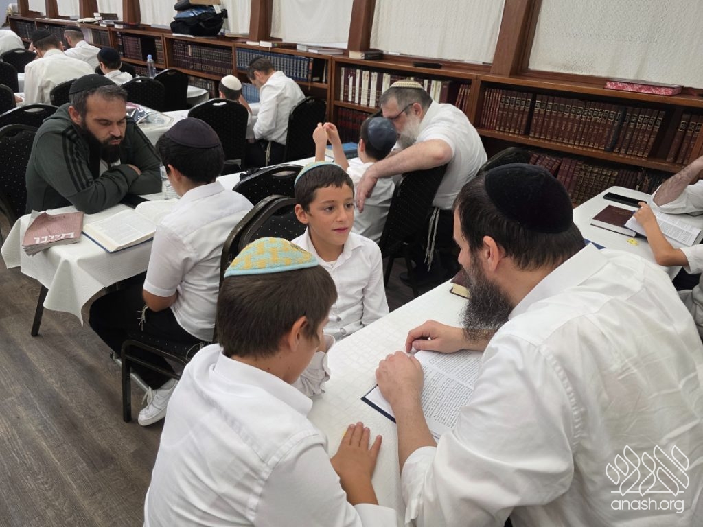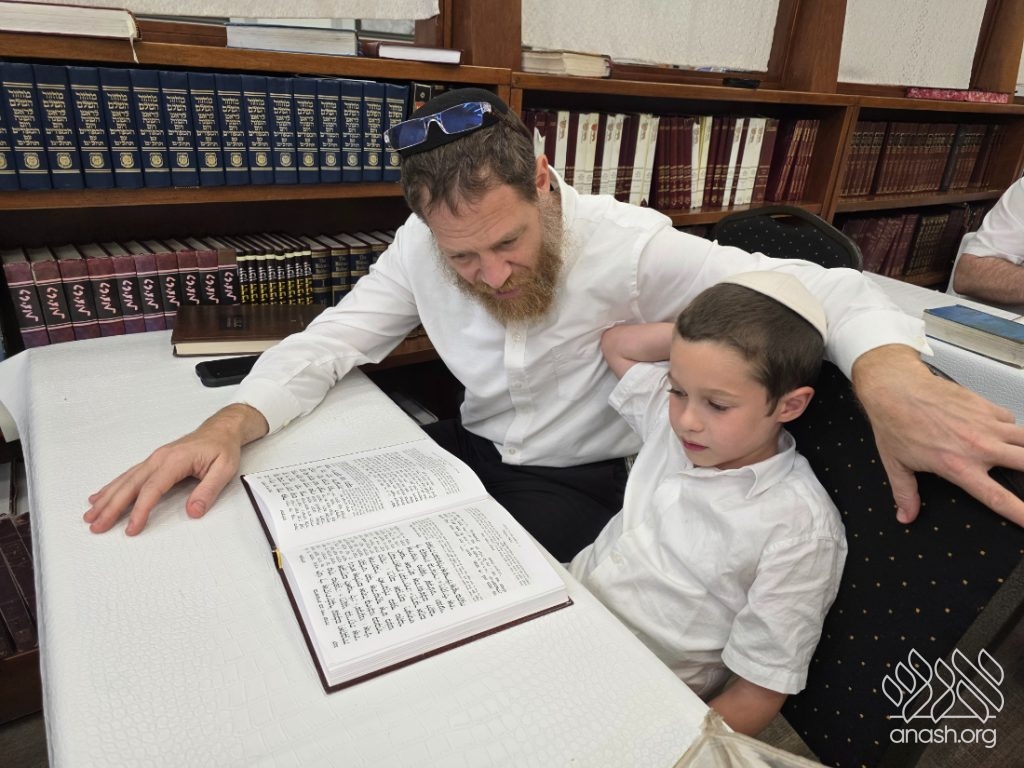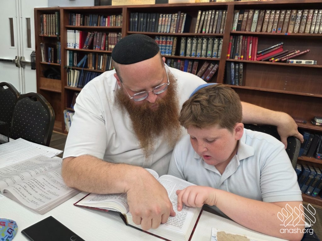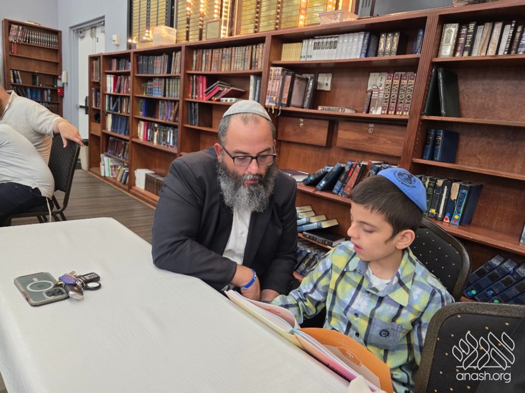 The program gathered fathers and sons from across the community for an hour of quality learning time after Shabbos concluded. The fathers chose a sefer, reviewing material their sons had studied in school, or learning a new topic together with their children.