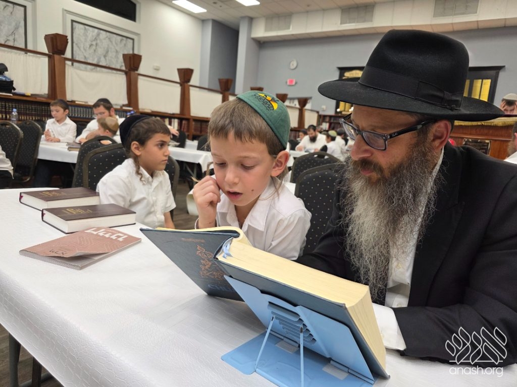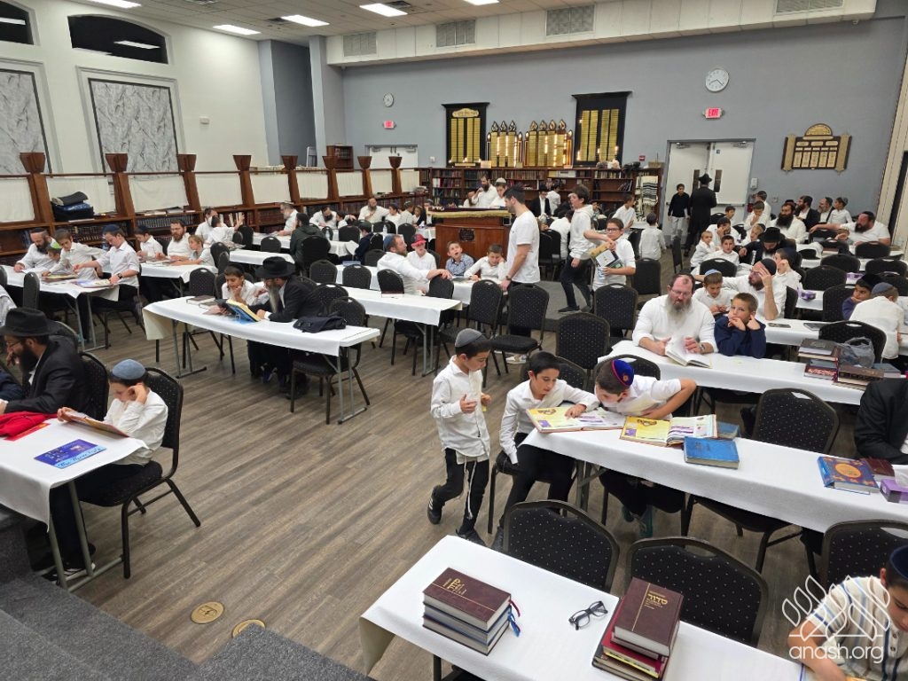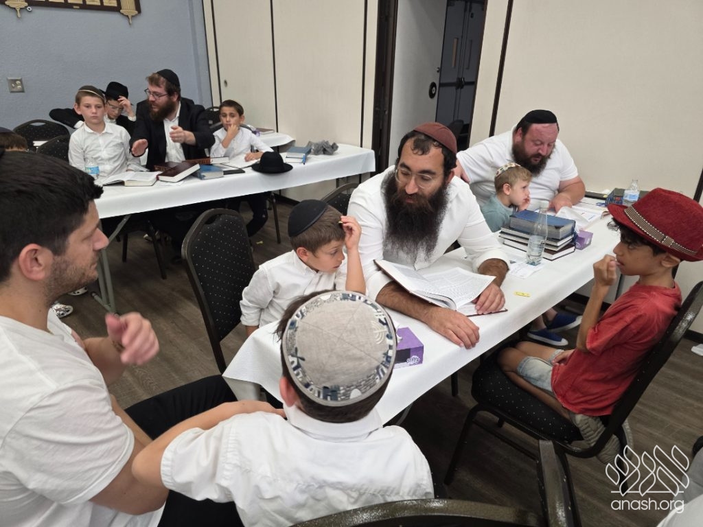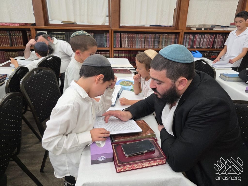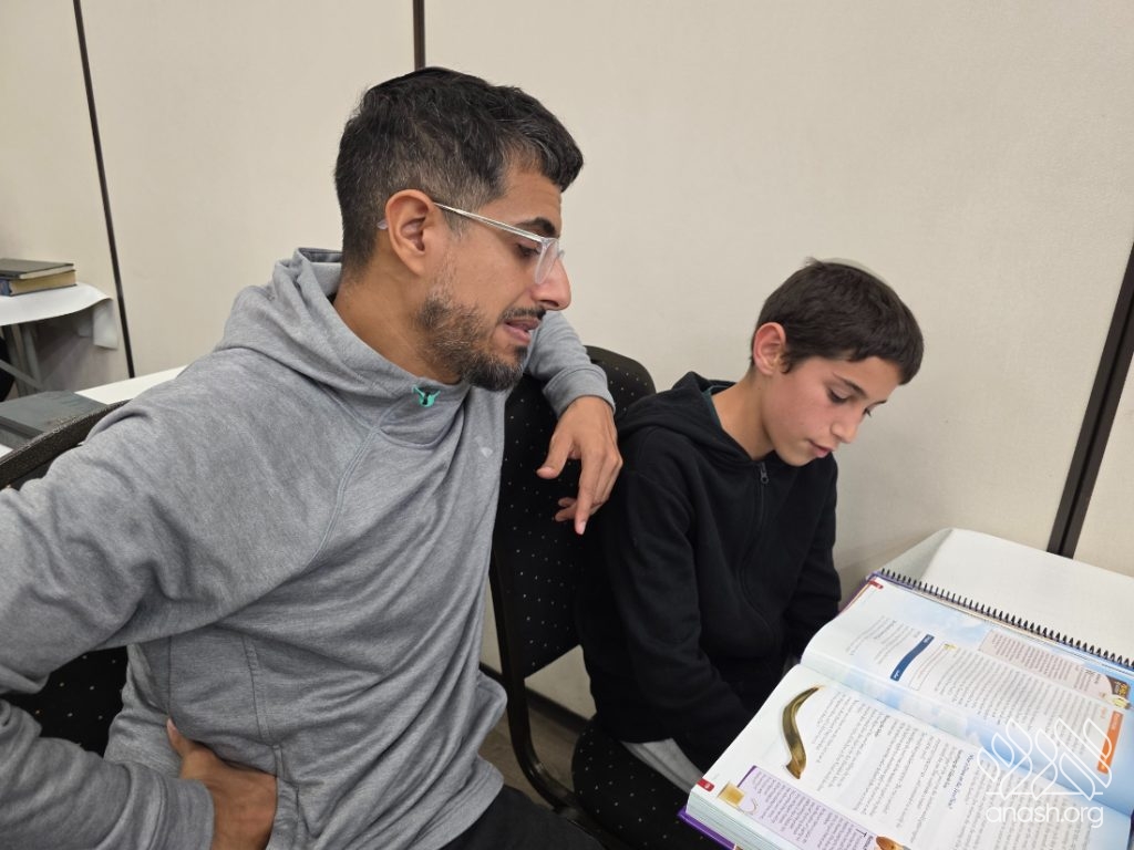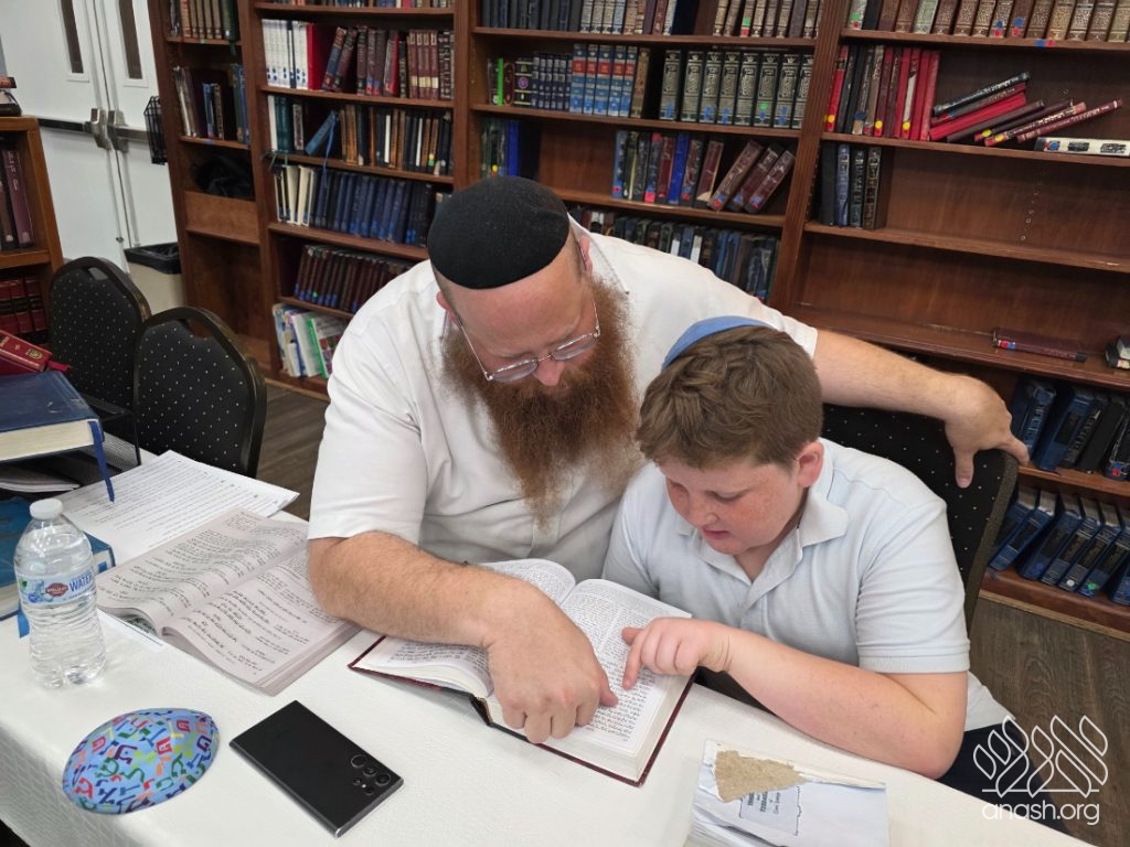The program gathered fathers and sons from across the community for an hour of quality learning time after Shabbos concluded. The fathers chose a sefer, reviewing material their sons had studied in school, or learning a new topic together with their children.