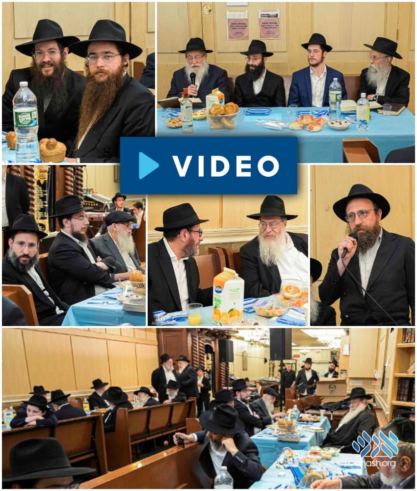 Multiple Crown Heights daily Rambam shiurim held a joint Siyum Harambam farbrengen and seudas mitzva with their maggidei shiurim at Empire Shteibel.