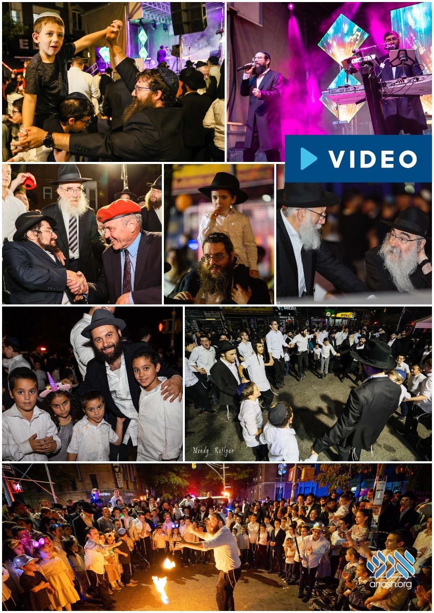 Thousands of Yidden took part in the annual Simchas Beis Hashoeiva held on Kingston Ave. in Crown Heights on the first night of Chof Hamoed. Music was provided by Chony Milecki, Chony Zucker, Yossi Cohen, and others.