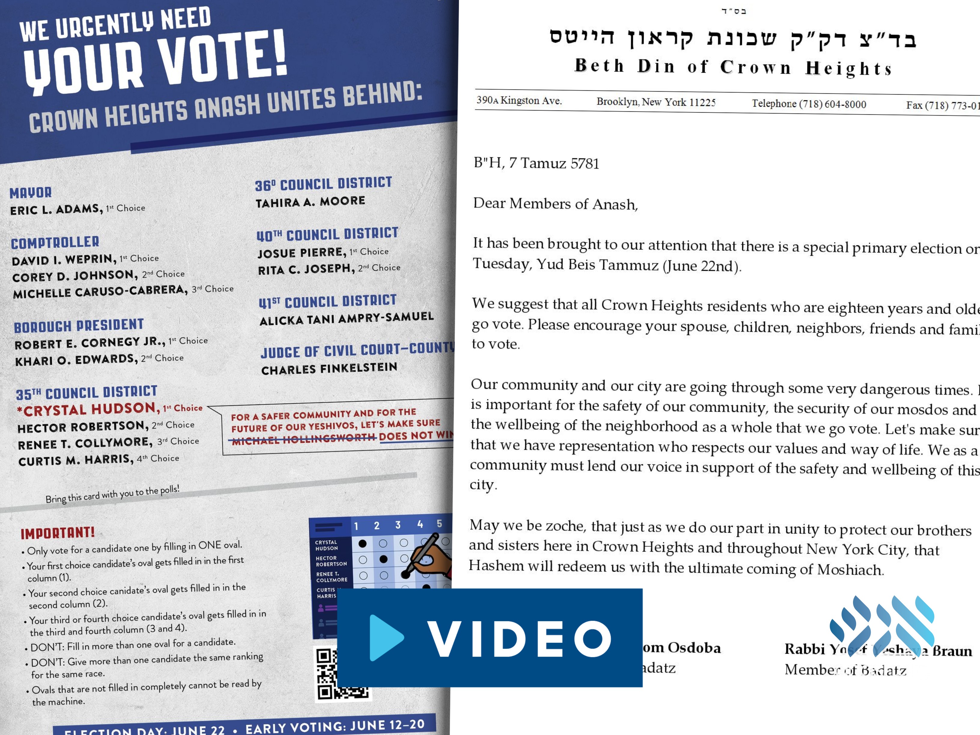 “It has been brought to our attention that there is a special primary election on Tuesday, Yud Beis Tammuz (June 22nd),” Rabbis Osdoba and Braun wrote. “We suggest that all Crown Heights residents who are eighteen years and older go vote. Please encourage your spouse, children, neighbors, friends and family to vote.”