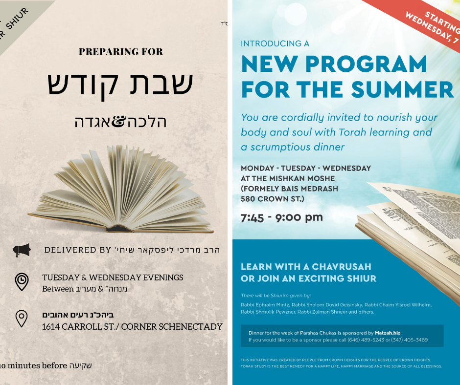 Two new learning programs have been arranged for this summer. One series of shiurim is beginning tonight and will be held at Mishkan Moshe (580 Crown St.); the other, which has already begun, takes place at the Reiyim Ahuvim shul.