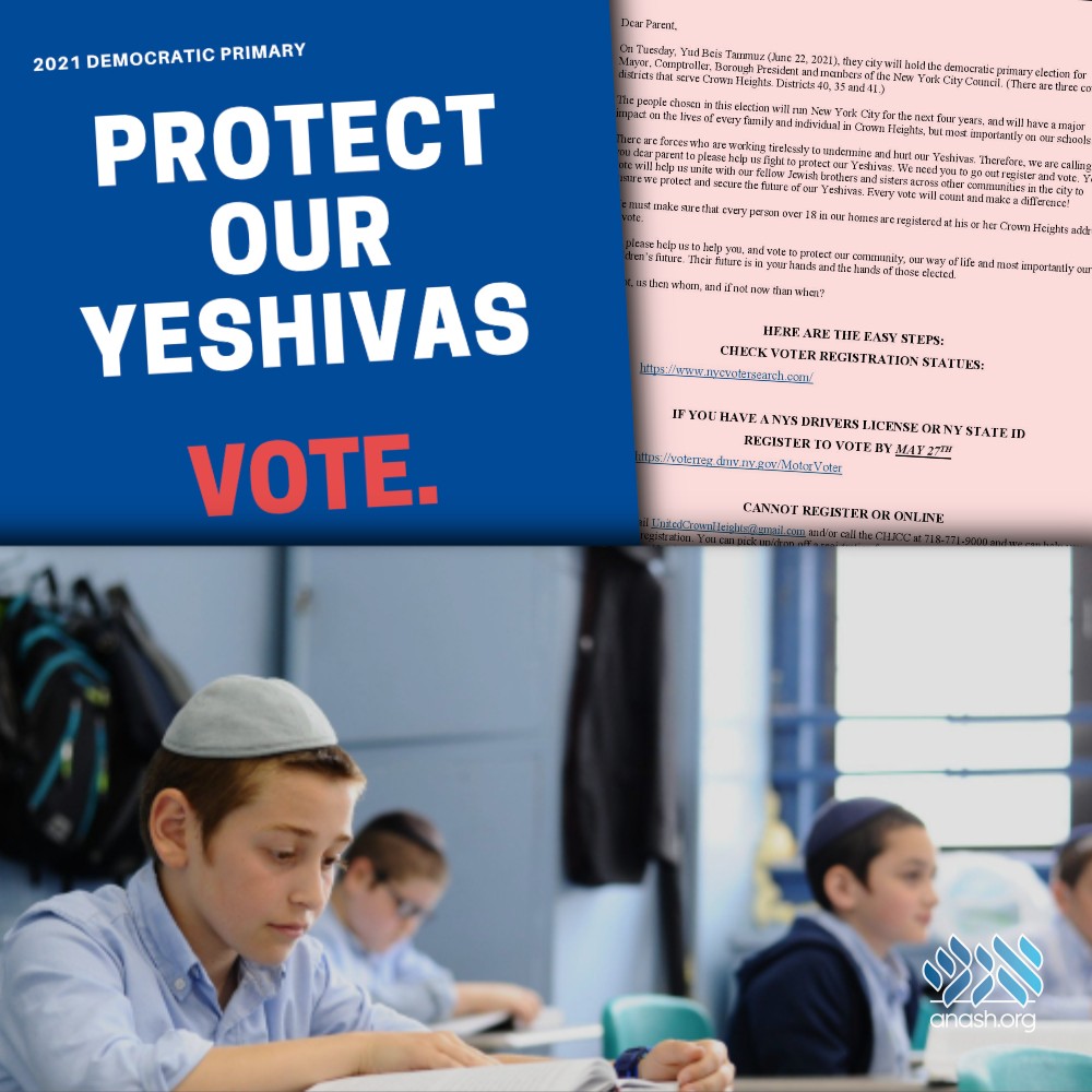 There are forces who are working tirelessly to undermine and hurt our Yeshivas. Therefore, we are calling on you dear parent to please help us fight to protect our Yeshivas. We need you to go out register and vote. Your vote will help us unite with our fellow Jewish brothers and sisters across other communities in the city to ensure we protect and secure the future of our Yeshivas. Every vote will count and make a difference!