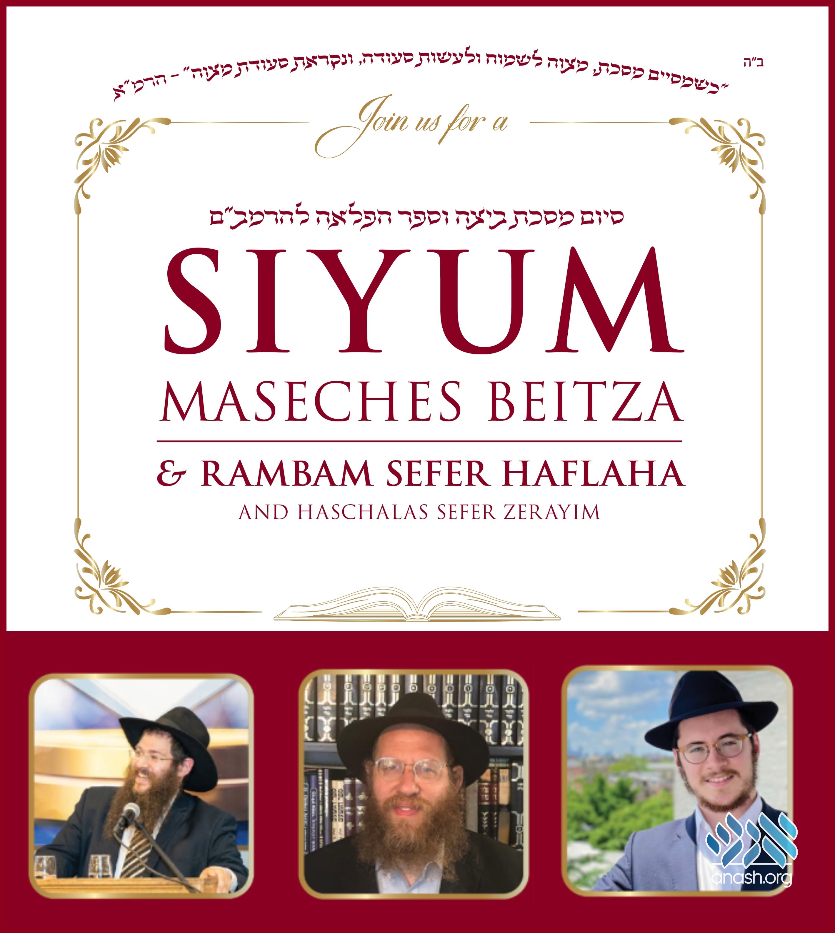 Featuring Siyumim and speeches by Rabbi Alexander Heppenheimer: Siyum Meseches Beitza. Rabbi Michael Zajac: Siyum Harambam on Sefer Haflaha. Rabbi Mendel Yuzewitz: Haschalas Sefer Zerayim