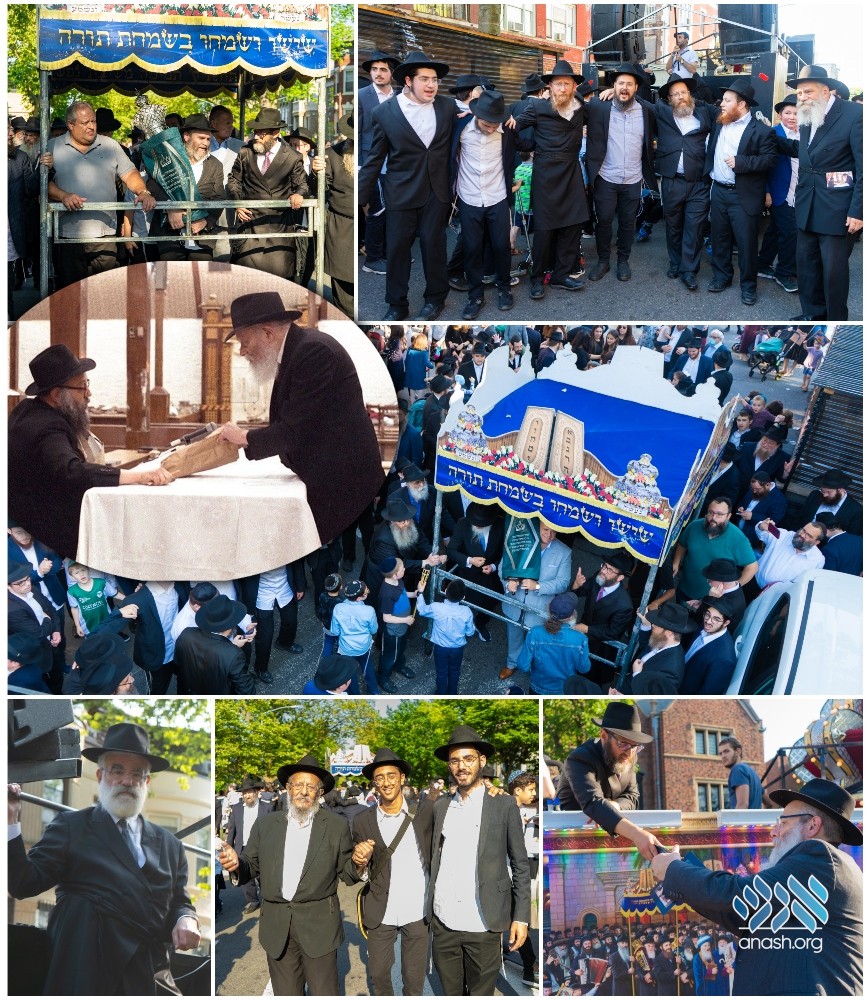 Rabbonim, shluchim, mashpi’im, locals and guests gathered as a new Torah, dedicated in memory of Rabbi Leibel Groner, the Rebbe’s mazkir, was paraded on Crown Heights streets with music and dancing towards 770, where joyous hakafos were held.