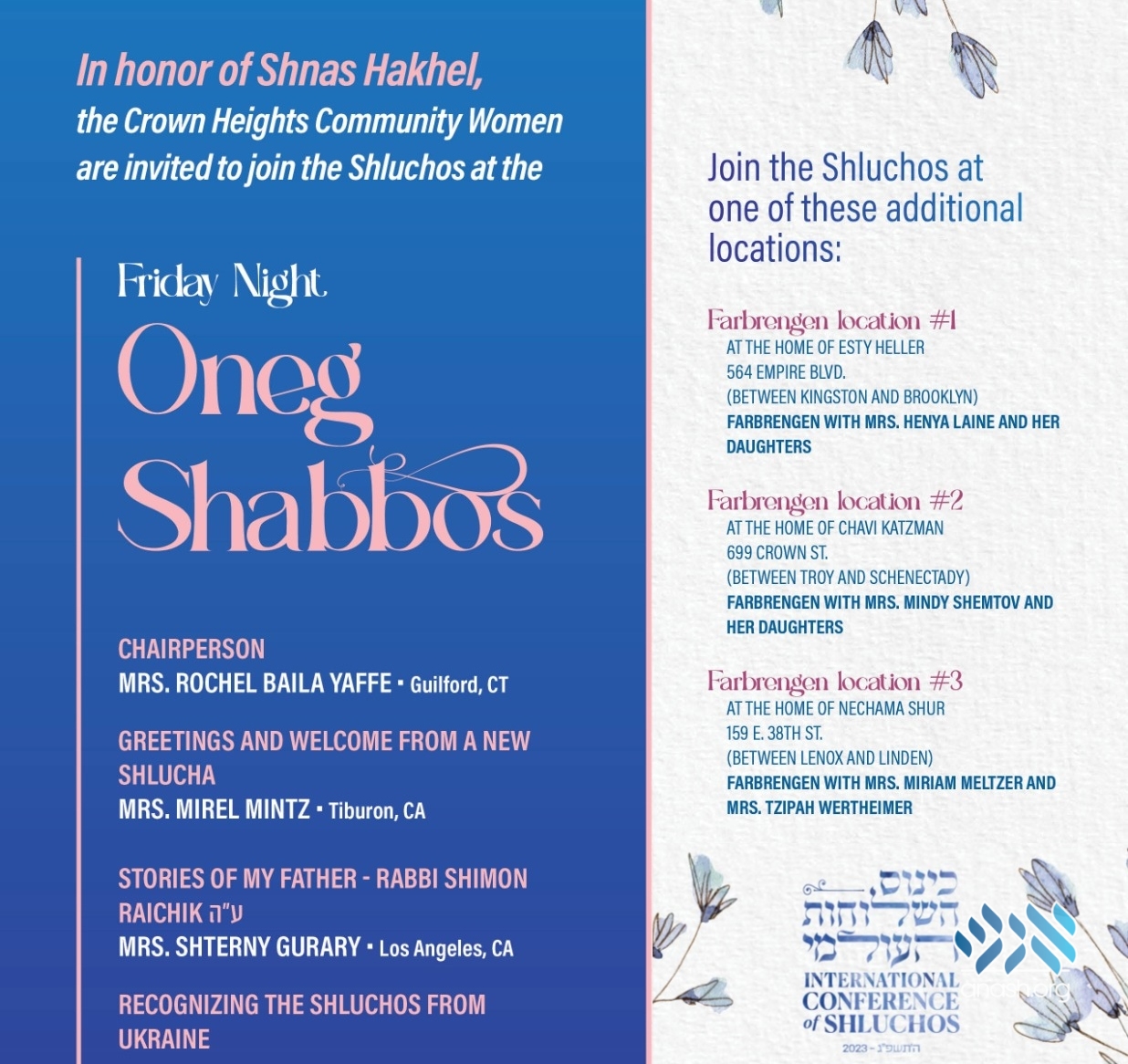 In the spirit of the Hakhel year, the Kinus Hashluchos is inviting all women of the Crown Heights community to join the Friday night Oneg Shabbos and Farbrengens taking place in the neighborhood this week.