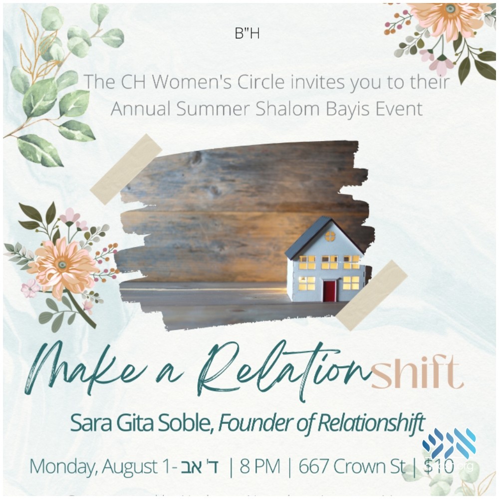 The Crown Heights Women’s Circle will be holding their Annual Summer Shalom Bayis Event with speaker Mrs. Sara Gita Soble, founder of ‘Relationshift’, on Monday Night.