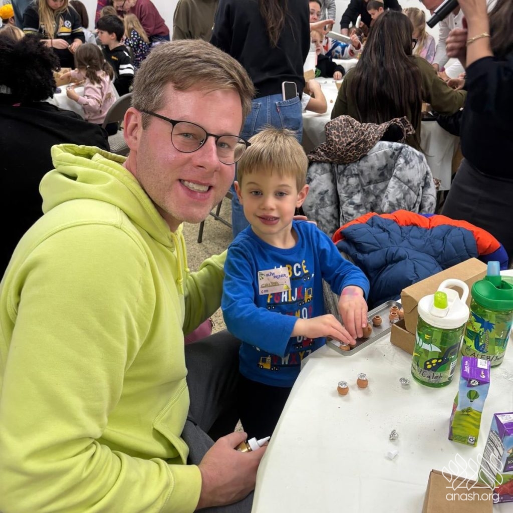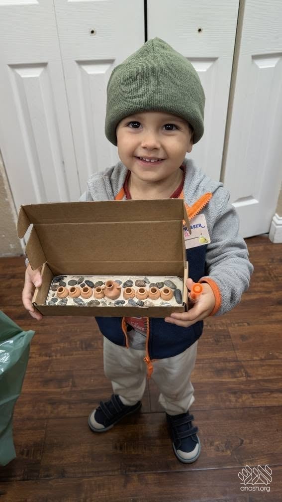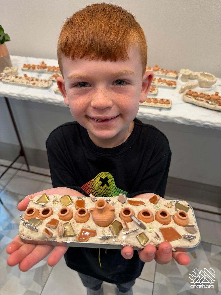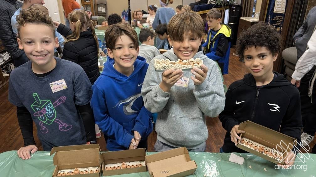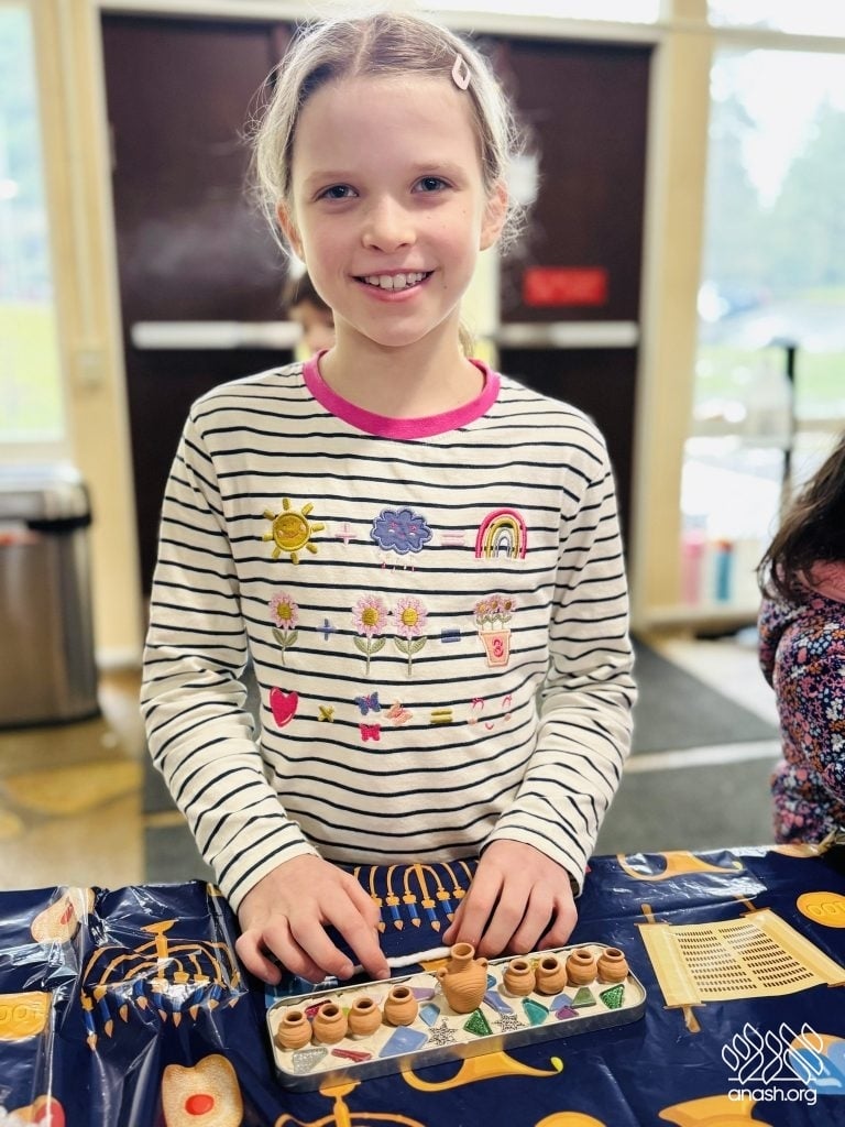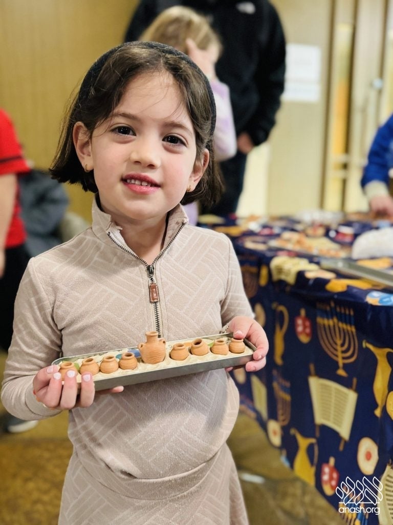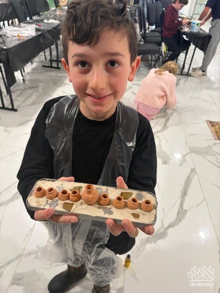 Next came the Maccabee Investigation, a high-energy mission to recover nine lost items through a modern twist on the traditional dreidel game. With dreidels spinning and clues unfolding, children became detectives searching for the hidden treasures of the Beit Hamikdash. The investigation concluded with the discovery of nine clay jugs, which children used to craft their very own Miracle Jug Menorah, a highlight of the event. Each child created a beautiful menorah to bring home and light themselves.