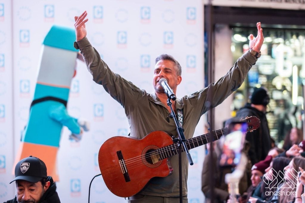 The emotional peak arrived when Matan Zangauker, Ilana Gritzewsky, and Segev Kalfon, freed hostages, took the stage and declared “Shema Yisrael” together with the teens. Among them was Segev Kalfon, who had dreamed of saying Shema upon his release from Hamas captivity. He said it Saturday night, not from a cellar in Gaza, but from a proud Jewish stage in the heart of Times Square. Singer Noam Buskila then joined the hostages and teens for a heartfelt “Shir Hama’alos.”
