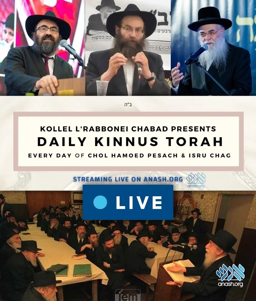 Kollel L’rabbonei Chabad presents a daily Kinus Torah every day of Chol Hamoed Pesach and Isru Chag.