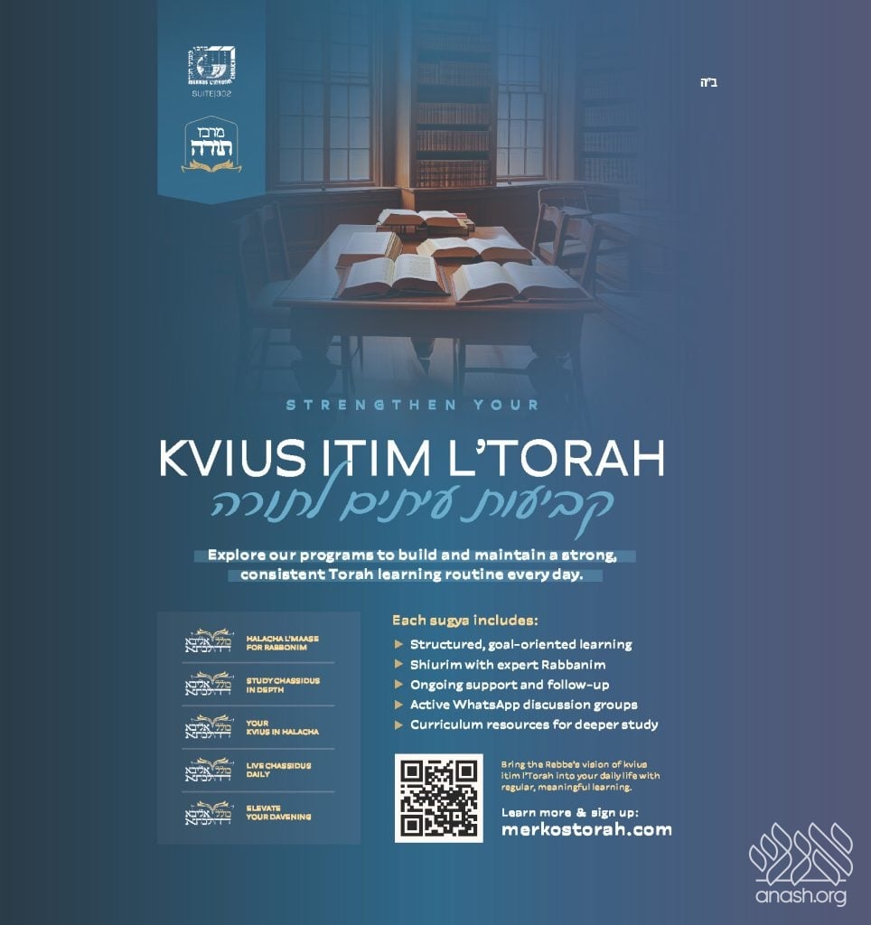 Rabbi Mendel Chaiton, Director of Merkos Torah, explains, “Merkos Torah’s goal is to turn the Rebbe’s call for kvius itim l’Torah into a real part of people’s lives. With clear structure and strong community, and top-tier Magiddei Shiurim, it helps make daily learning consistent and geshmak.”