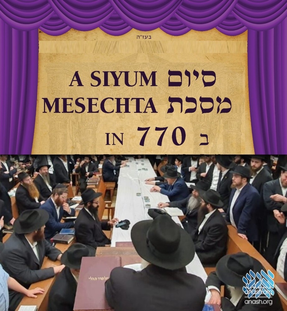 A siyum will be taking place in 770 every day over the coming two weeks to fulfill the Rebbe’s directive to hold siyumim during the Nine Days and continue until 15 Av. The siyum will take place every night at 9:45 PM and on Shabbos after each tefila.