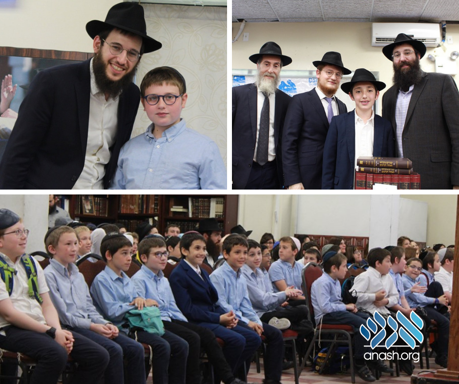 Following a video showing talmidim presenting their gift of MBP to the Rebbe, the top 3 talmidim were called up: 1st place Baruch Dukes (from Rabbi Raskin’s Kita Hey), 2nd place Mendel Spritzer (from Rabbi Lifshitz’s Kita Zayin) and 3rd place Chezki Pinson (from Rabbi Sarue’s 6th grade).