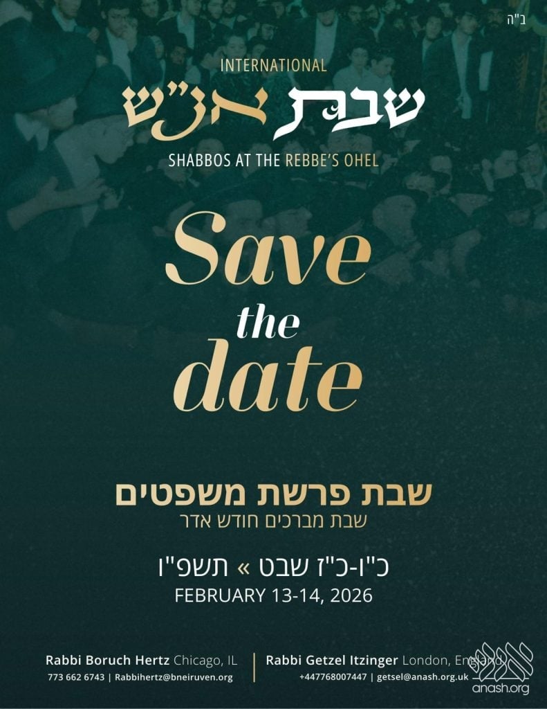 The second annual Shabbos Anash, which brought Anash communities together for a beautiful and inspiring Shabbos at the Ohel, creating a strong sense of unity and connection, is set for Shabbos Mishpatim, 26-27 Shevat.