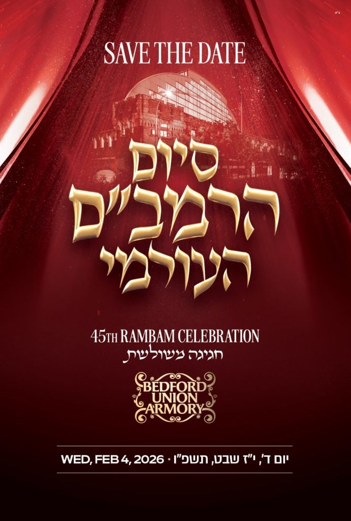 The International Rambam Celebration Committee announced that the upcoming Triple Siyum Horambam – for 3 perokim, perek echad and sefer hamitzvos – will be celebrated at the historic Bedford Union Armory on Wednesday, 17 Shevat 5786.
