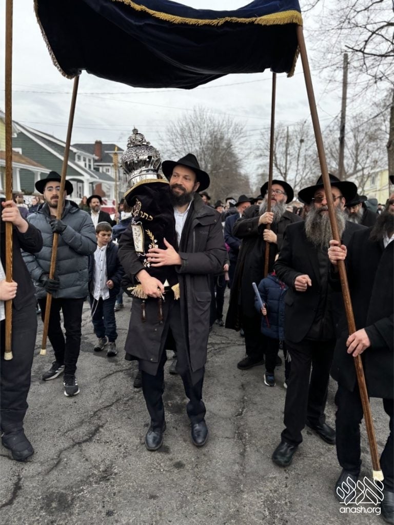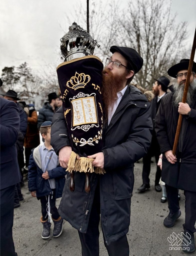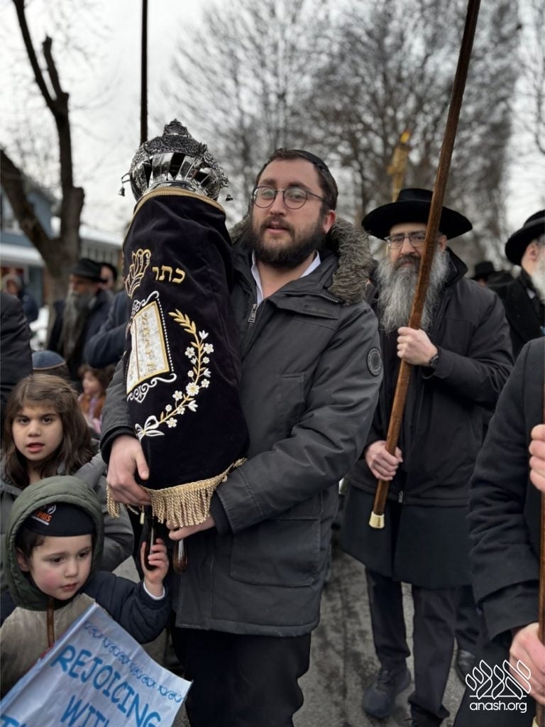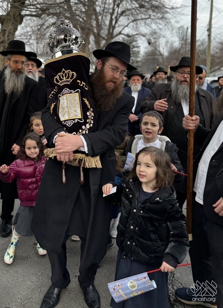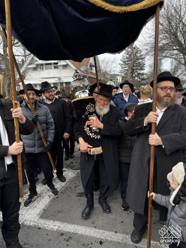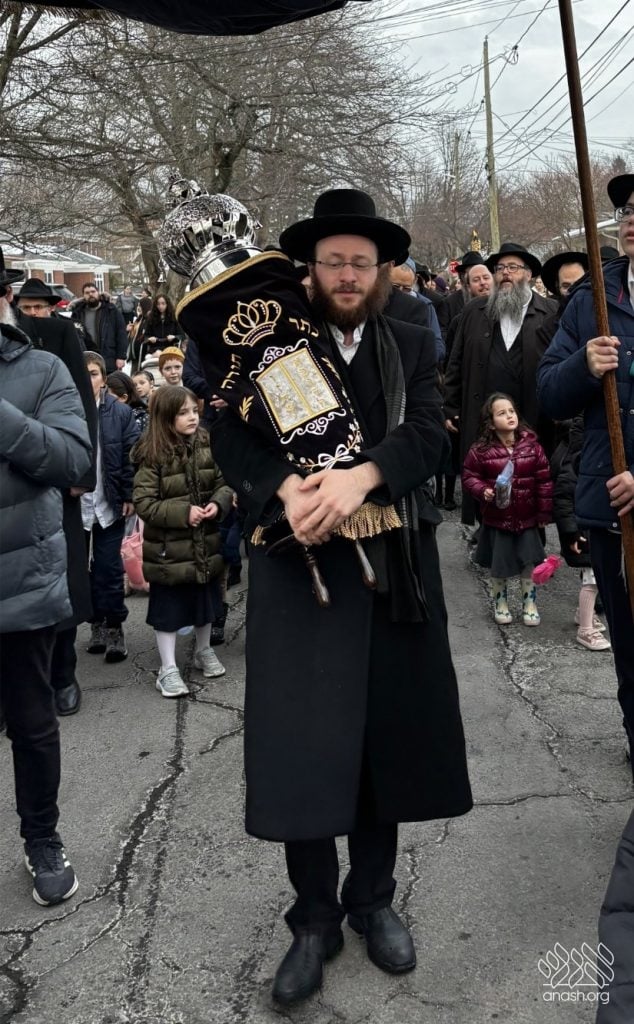 The final letters were written in the Zirkind home, where the project had taken place over the years. From there, the community marched in a grand parade with torches, pekelach, and music by R’ Dovid Altein to the Beis Moshe shul.