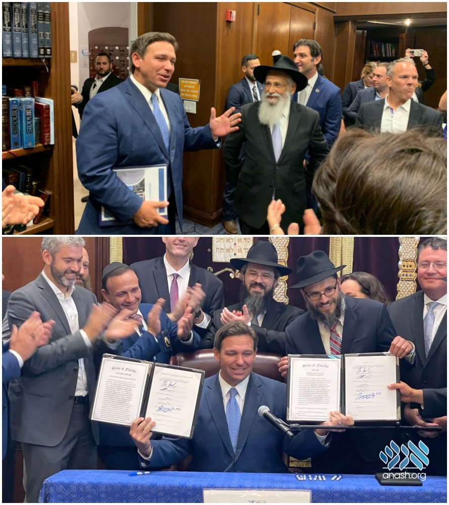 On Monday, Florida governor Ron DeSantis visited The Shul of Bal Harbour, where he signed two bills into law, one requiring a moment of silence at schools and another advancing Hatzalah of South Florida.