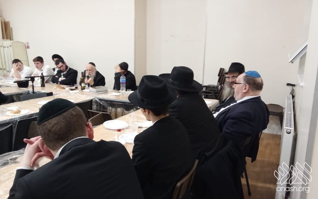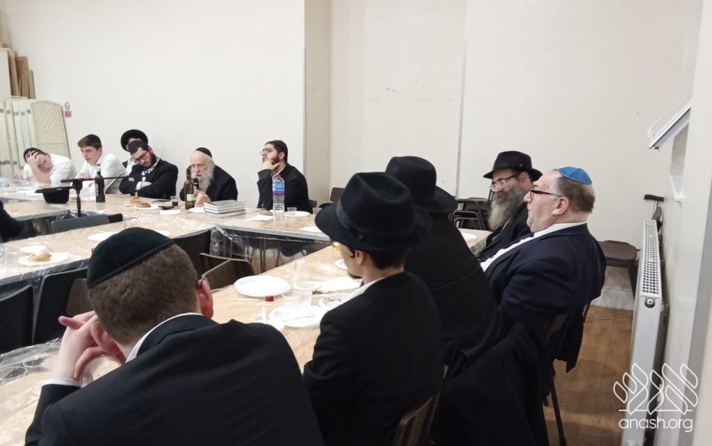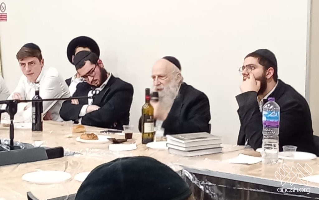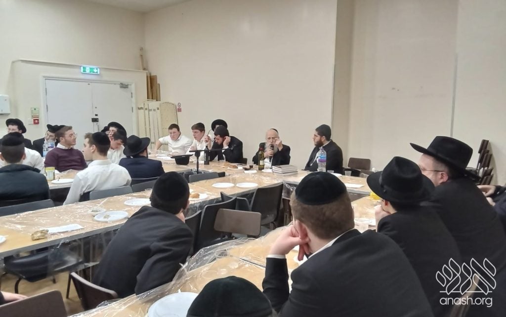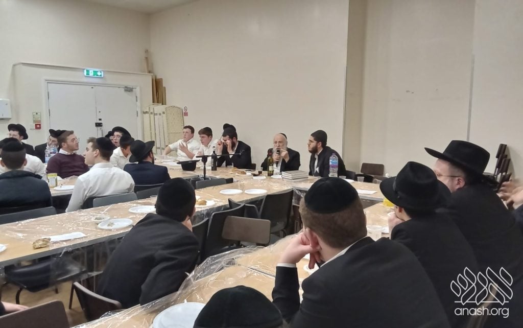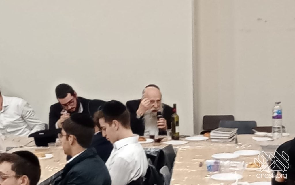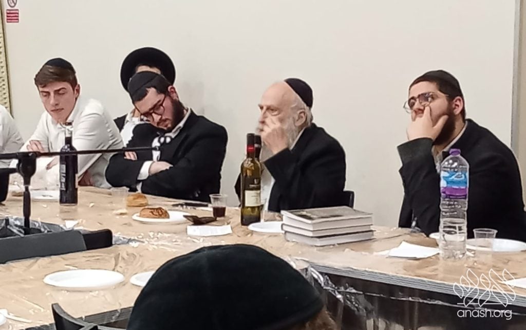 The farbrengen featured Rabbi Yechiel Menachem Mendel “Chilik” Kalmenson, Rosh Yeshiva of Tomchei Temimim Brunoy, who farbrenged for many hours, weaving chidushei Torah with the practical avodah demanded by chassidus.