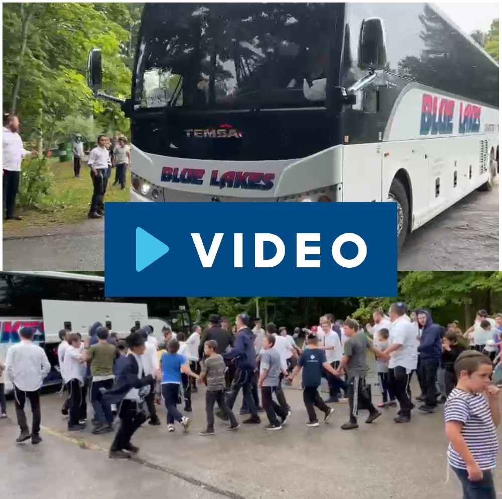 100 bochurim of the Bar Mitzvah Division of Gan Yisroel Detroit set out on a 16-hour bus ride from Tustin, Michigan to be with the rebbe on Chof Av. The younger division of camp went out to see them off with song and dance.