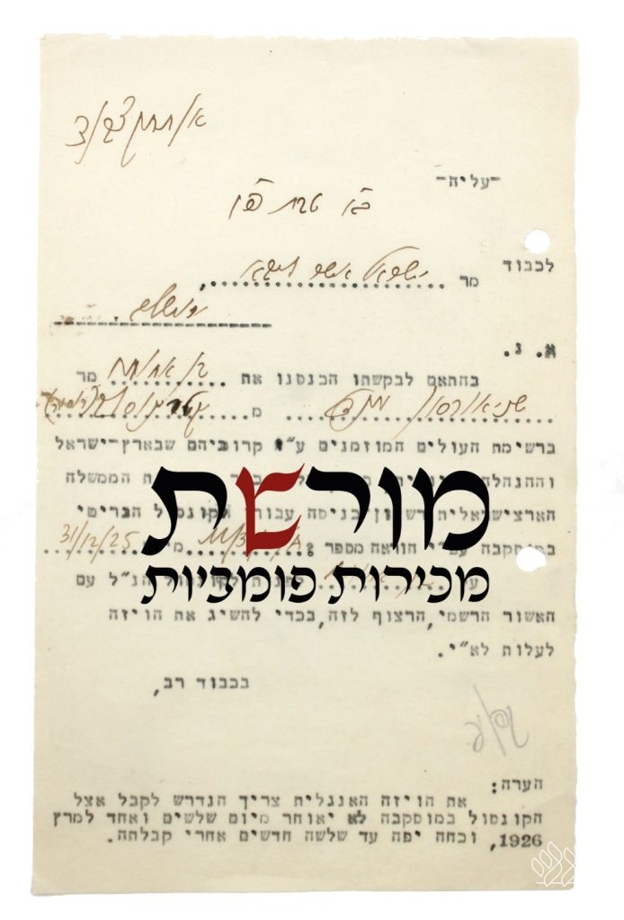A previously unknown document, now being auctioned off by the Moreshet Auction House, along with many other Chabad items in their 20th Chabad auction, reveals that the Rebbe received approval from the immigration department in Eretz Yisroel to immigrate to Eretz Yisroel.