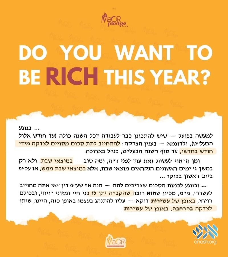 This Motzei Shabbos, follow the Rebbe’s instructions from Nitzovim-Vayelech 5743: If you want Hashem to bless you with children, health and livelihood in abundance, you need to give as generously as a wealthy person! Check inside for a great opportunity the Rebbe’s instruction, and grant yourself Hashem’s Bracha for the new year!