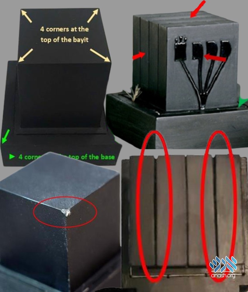 The requirement for the batim to be perfectly square means that each bayit must have 12 perfectly shaped points. These 12 points consist of: a) the four corners at the top of the bayit; b) the four corners at the top of the larger square base upon which the bayit rests; c) the four corners at the bottom of this larger square base. (See accompanying illustrations.)