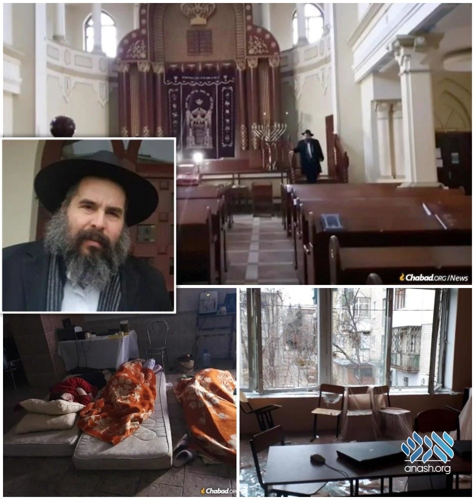 “This morning we still wanted to only send our children out, but the missiles and bombs have been hammering the center of the city, and they were raining down all night. We were warned this might be the last chance,” says a tearful Miriam Moskovitz, who together with her husband, Kharkov chief rabbi Moshe Moskovitz, has directed Chabad of Kharkov since 1990. “The apartment building next to our home was shelled last night; we came out in the morning and realized how close we were.”