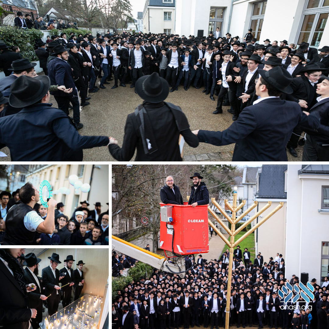 On the first candle of Chanukah, a grand Menorah lighting was held in the yard of the Brunoy Yeshiva. The lighting was arranged by the yeshiva and the community and was attended by the Mayor of Brunoy and friends of the yeshiva.