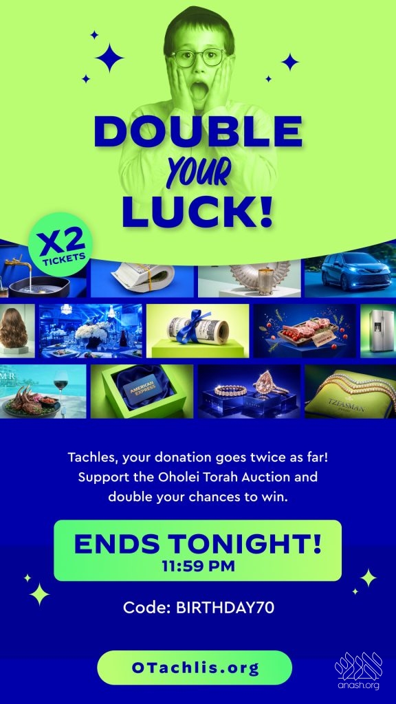Oholei Torah’s 70th birthday auction is in full swing, featuring over 45 luxury prizes designed for every stage and celebration. Now through Motzei Shabbos at 11:59 PM, take advantage of the Double Your Luck promotion and receive twice the chances to win.