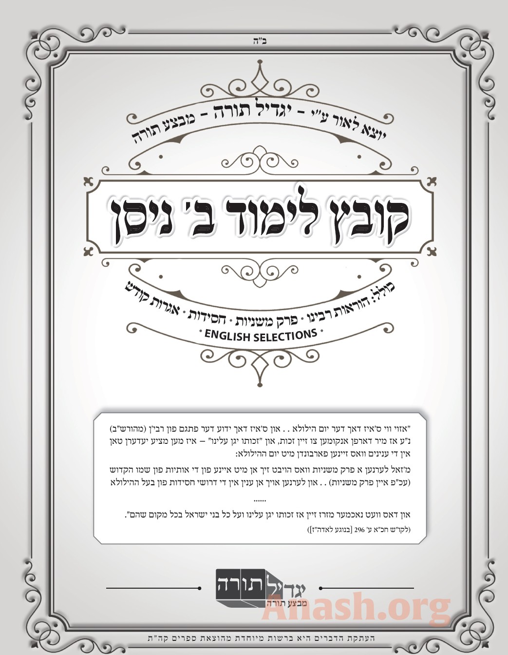 In connection with Beis Nissan, Yom Hilula of the Rebbe Rashab, Yagdil Torah has compiled a booklet containing Mishanyos, as well as teachings of the Rebbe Rashab.