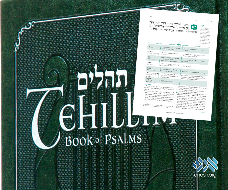 The PDF is an excerpt from Kehot’s edition of Tehillim, with commentary compiled by Rabbi Yosef Marcus, Shliach to S. Mateo, California. The full edition can be purchased at Kehot.