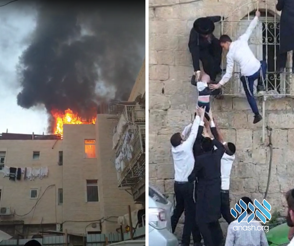 A four story building was ablaze in Yerushalayim this morning. Locals and passersby couldn’t wait for the firefighters to arrive, so they jumped into action. Video footage of the fire shows children being rescued from the building.