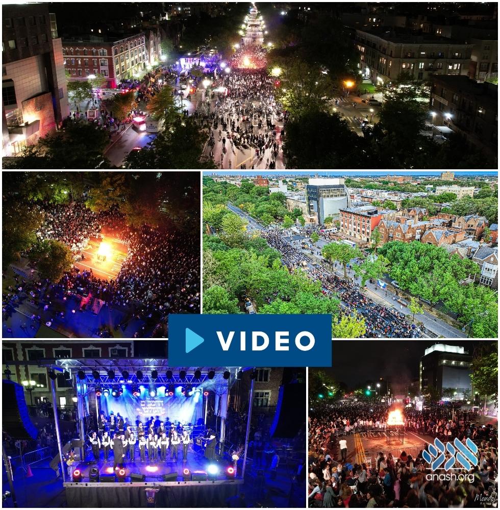 Drone captured beautiful shots of thousands of anash and bochurim gathered on Eastern Parkway to celebrate the Siyum Harambam and mark Lag B’omer with a bonfire and joyous dancing.