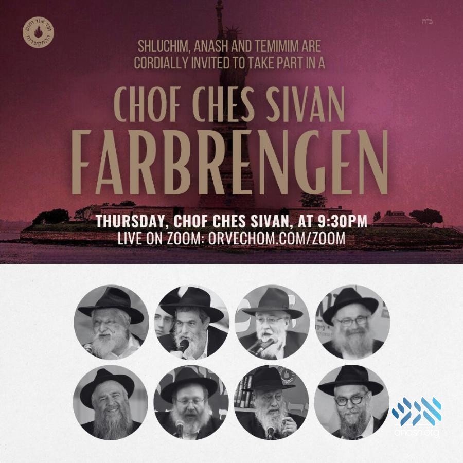 As Chassidim around the world celebrate the joyous day of Chof Ches Sivan, marking 83 years since the Rebbe and Rebbetzin’s safe arrival on the shores of the United States, and heralding a new wave of hafotzas hamaayonos, Vaad Or Vechom Hahiskashrus invites all Chassidim to participate in a Chassidishe Farbrengen on Zoom.