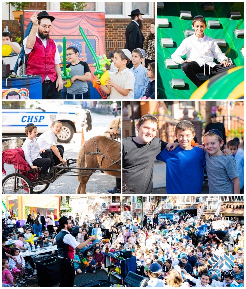 Members of the East Flatbush Chabad community gathered with their children on Chol Hamoed for a grand street fair with blow up rides, pony rides, arts and crafts, and a fire juggling show.