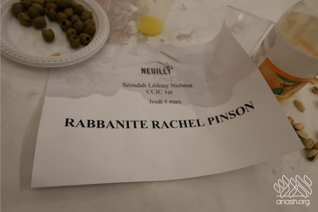 The large and emotional shloshim ceremony took place at the Neuilly shul, with words delivered by many speakers, highlighting the work and dedication of this devoted shlucha.