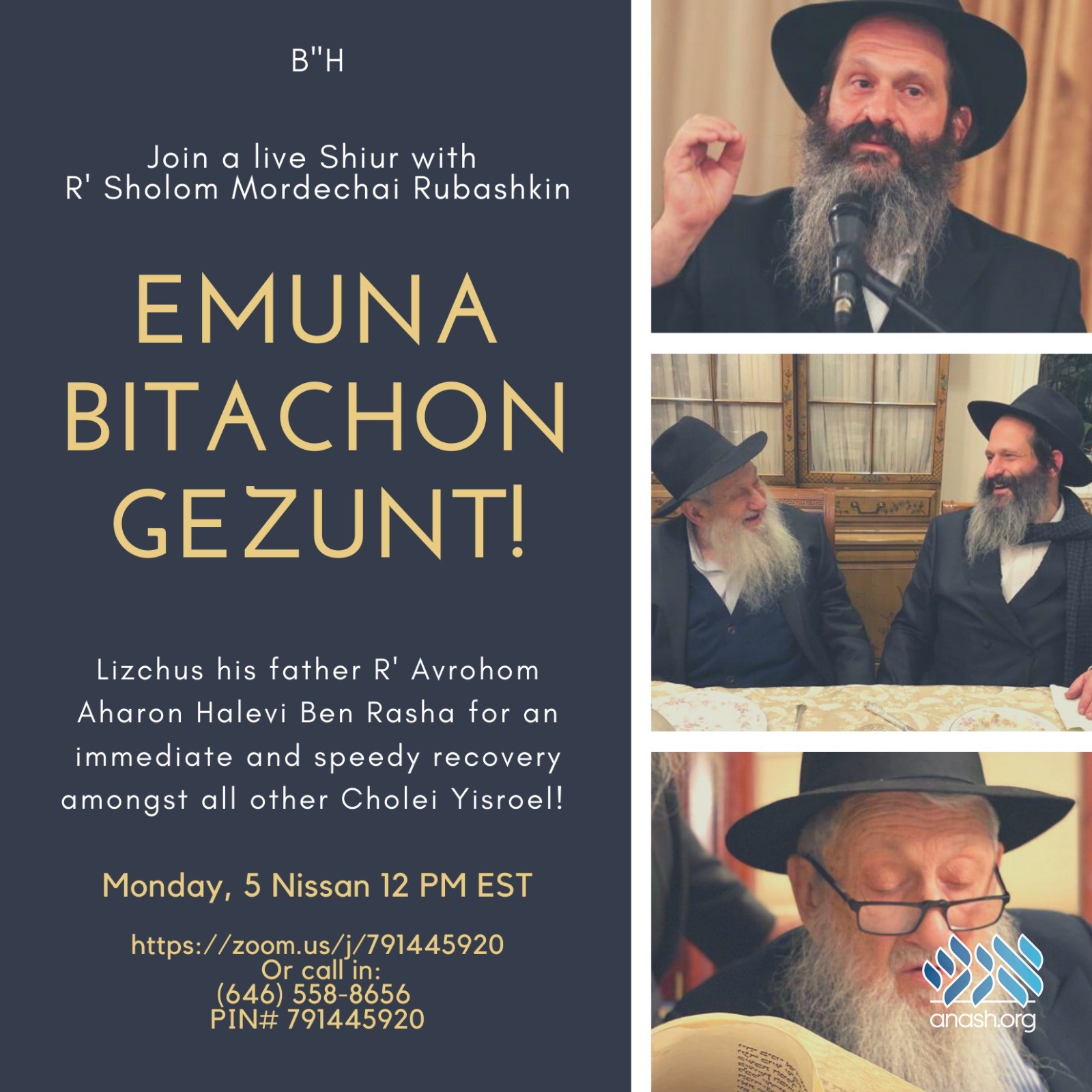 Join live at 12pm: Join a live shiur with Reb Sholom Mordechai Rubashkin on the topic of emunah, bitachon and gezunt, in the merit of the recovery of his father R’ Avraham Aharon HaLevi ben Rasha.